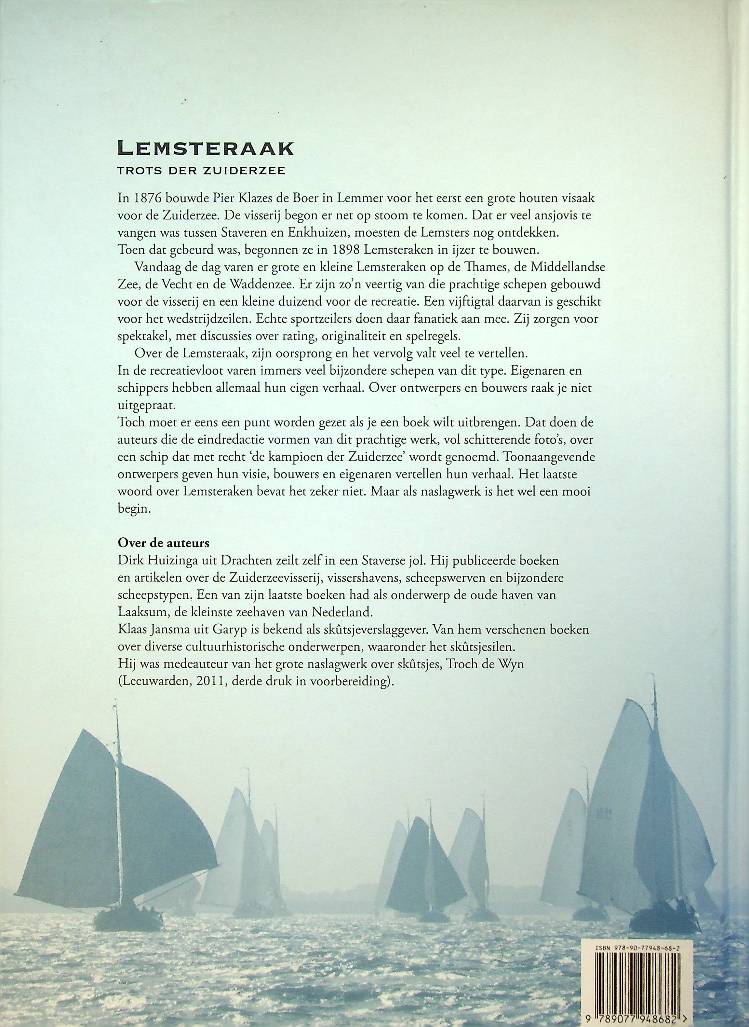 Huizinga, D. en K. Jansma: 2012 Leeuwarden, hardcover 390 blz. Rijk geïllustreerd naslagwerk over 110 jaar ijzeren en stalen Lemsteraken, waarin de ontwikkeling van robuuste Zuiderzee-visaken tot geliefde zeiljachten op de Nederlandse wateren wordt beschreven. Het boek behandelt bouwers, scheepstypen, techniek en historie, en geldt als standaardwerk voor liefhebbers van traditionele zeilschepen Zeer compleet boek. ISBN 9789077948682 In zeer goede staat