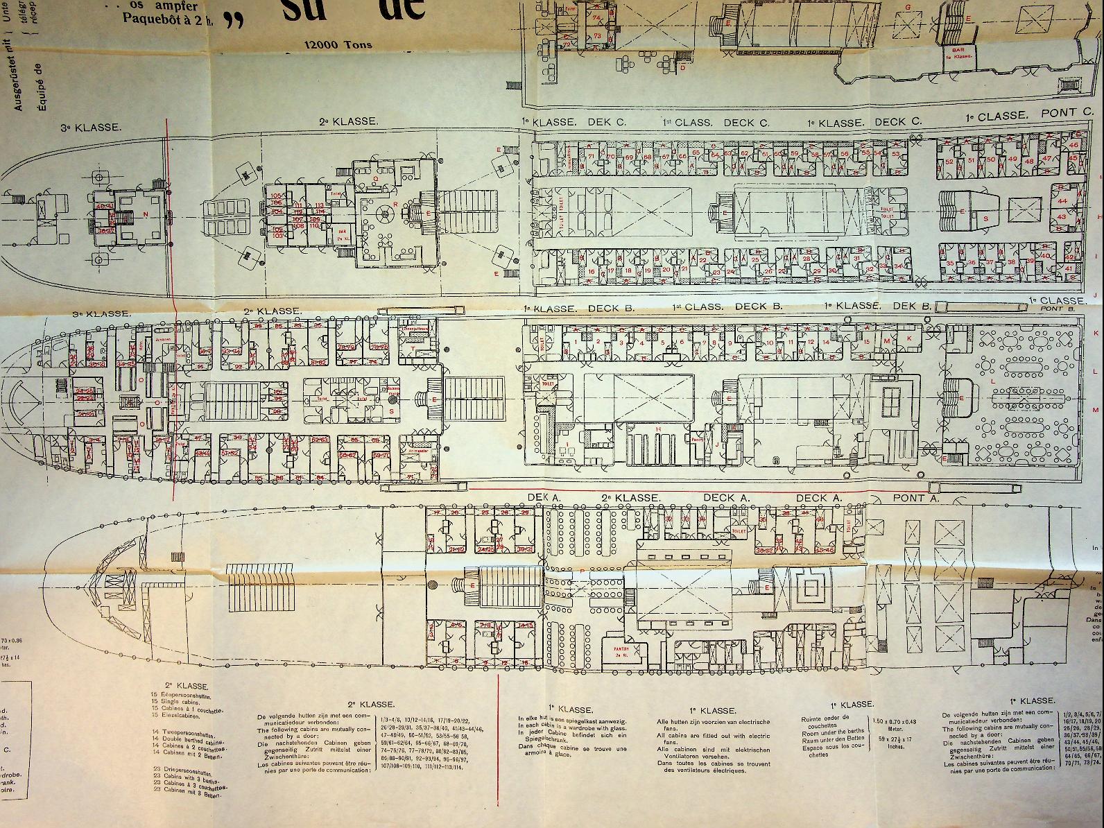Rotterdamsche Lloyd: 1913 Rotterdam, deckplan met alle ruimtes op het schip benoemd. Uitvouwbaar. In zeer goede staat