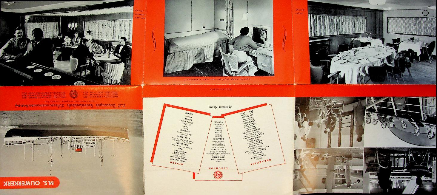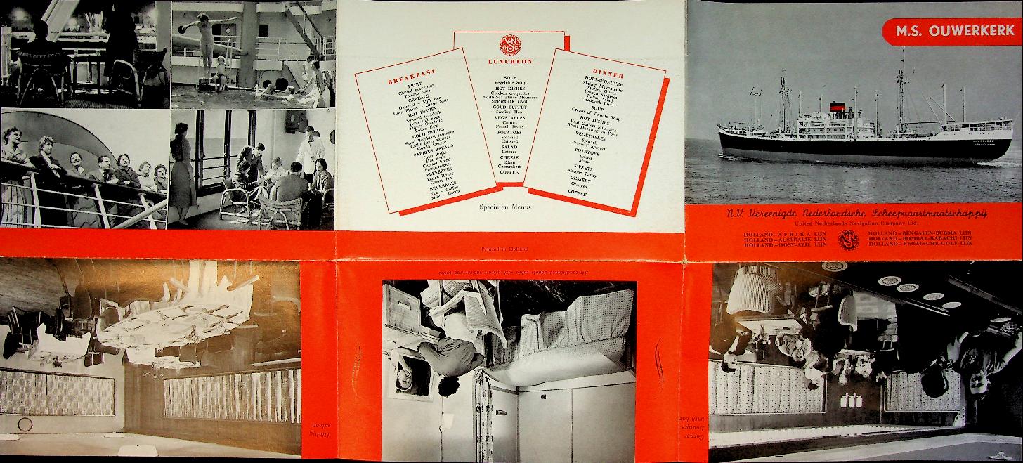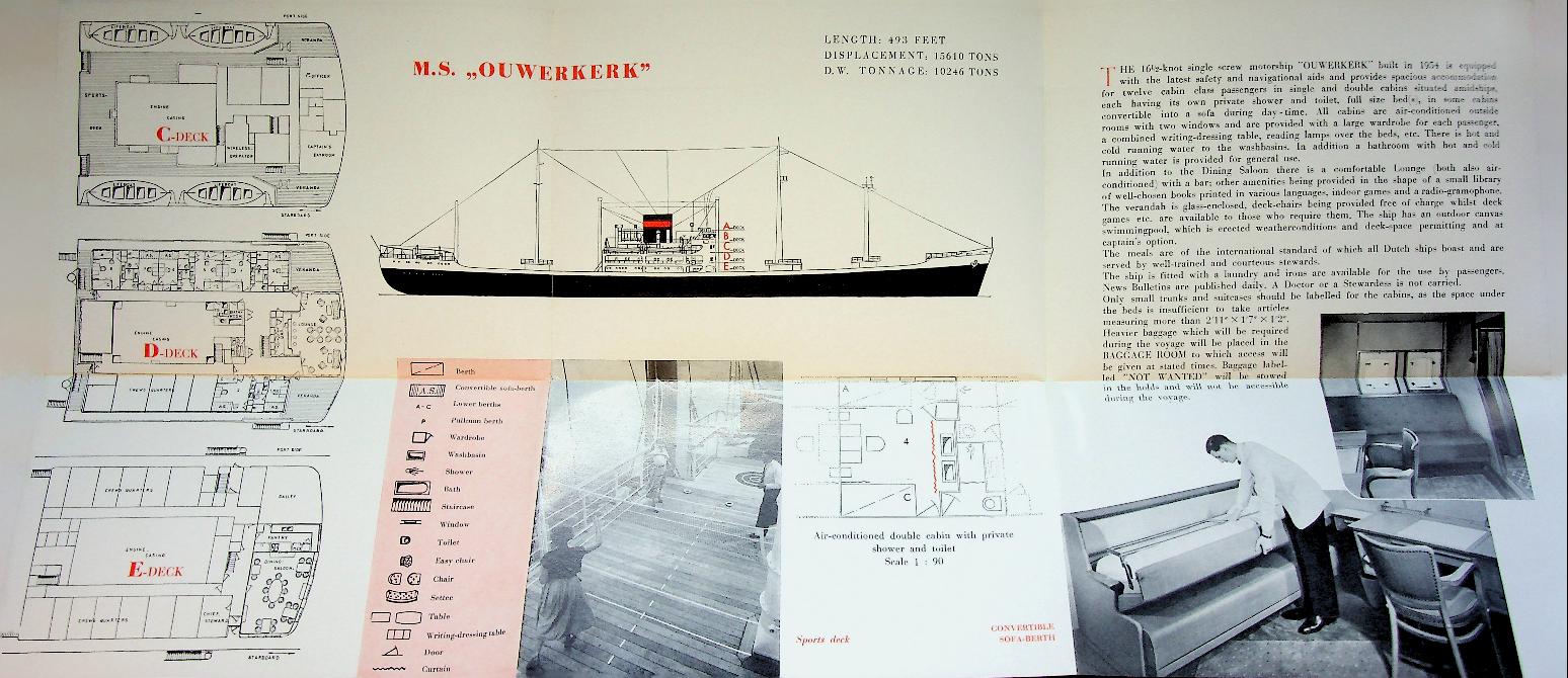 VNS: 50er jaren. In zessen uitklapbaar. Wanneer ingevouwen ansichtkaart formaat. Met foto's van schip en interieur, dekplannen en informatie over schip en route. m.s. Ouwerkerk was een gecombineerde passagier/vrachtschip. In zeer goede staat