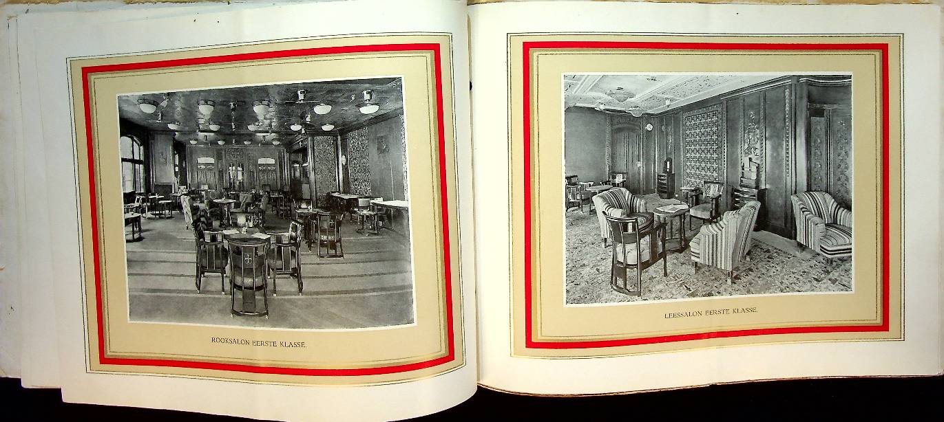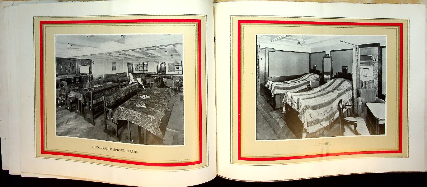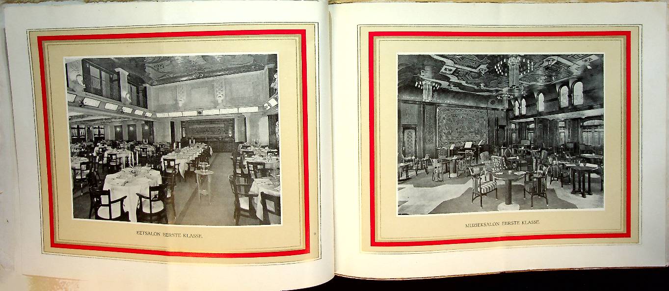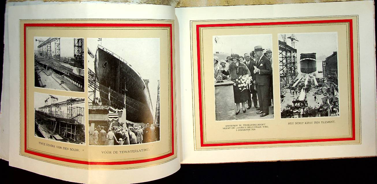 SMN: Ca. 1930, softcover 20 pages, bound with special chord. Very special Amsterdam School art brochure. Photo's of the ship and her interior, also the launching and the queen. Brochure has a fold in the middle. In good condition