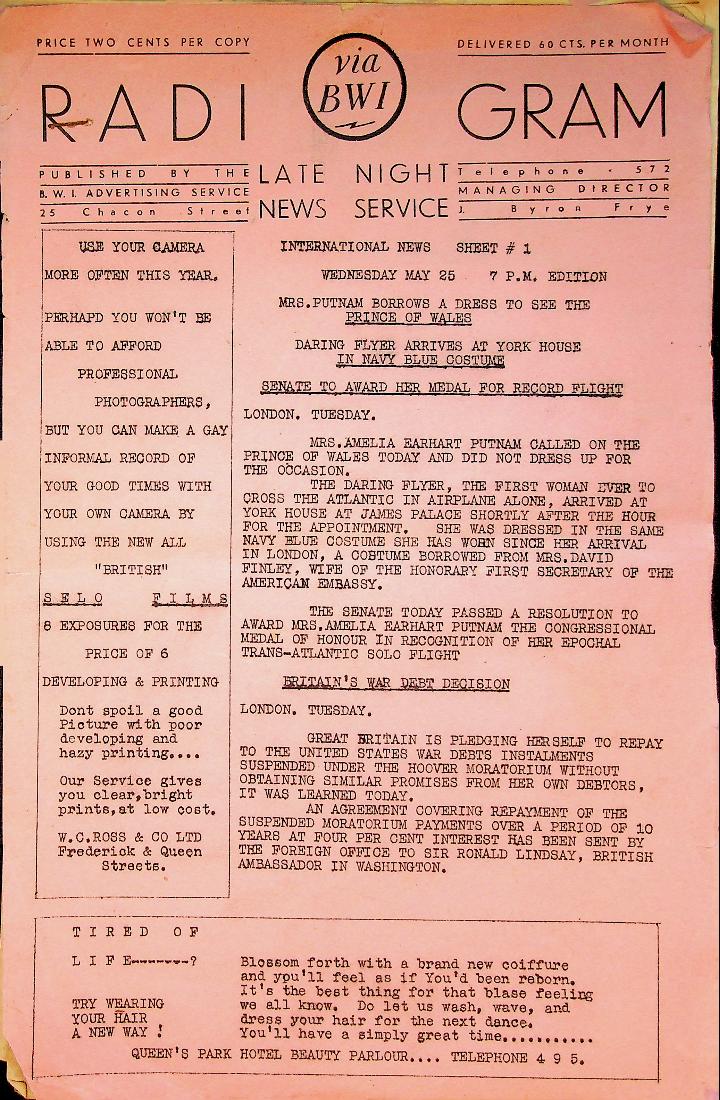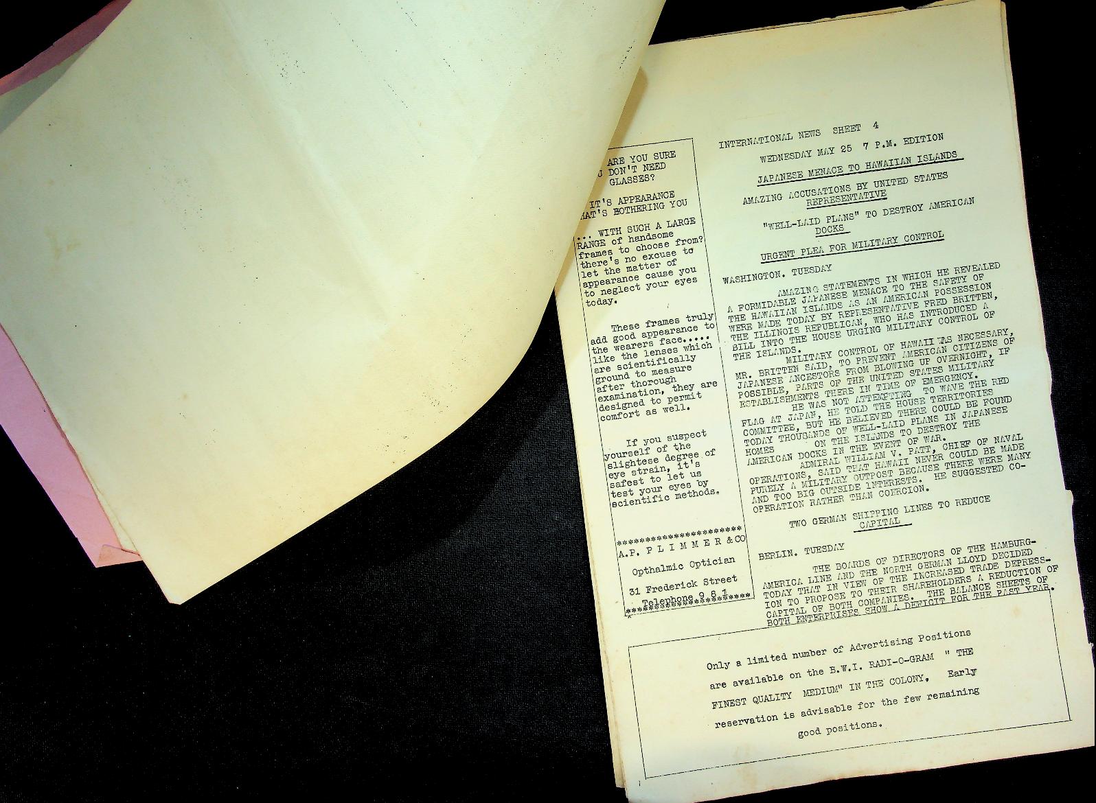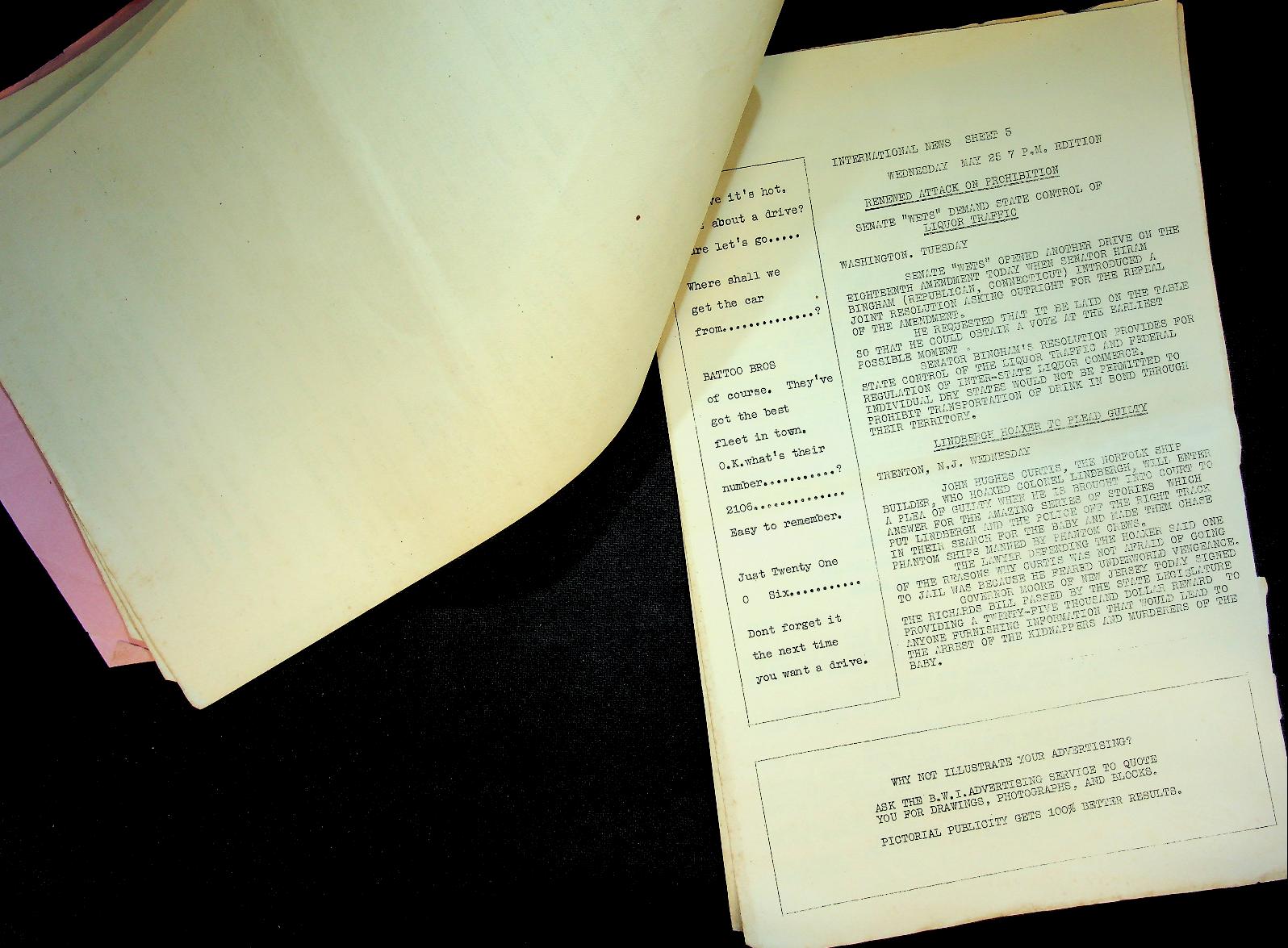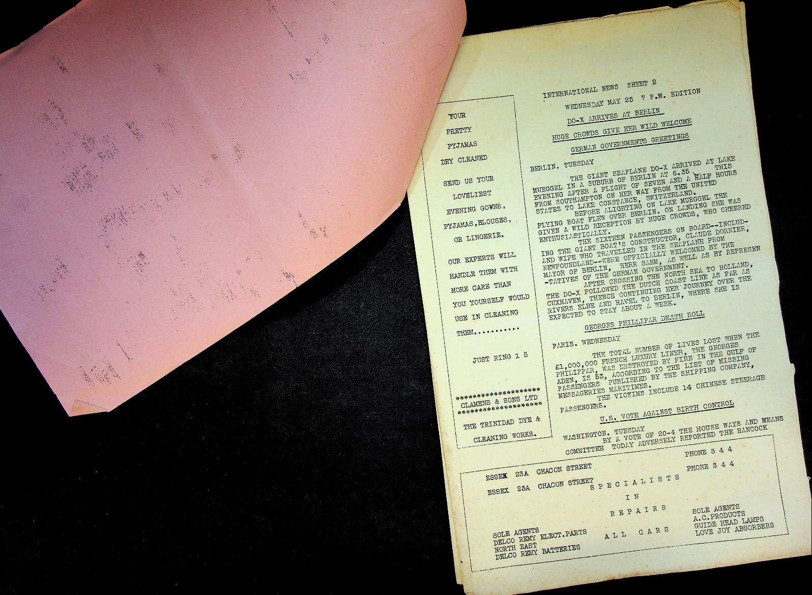 BWI: 25 May 1928, softcover 14 pages. Newsbulletin on ships, typed on board the ship. Information came by radio