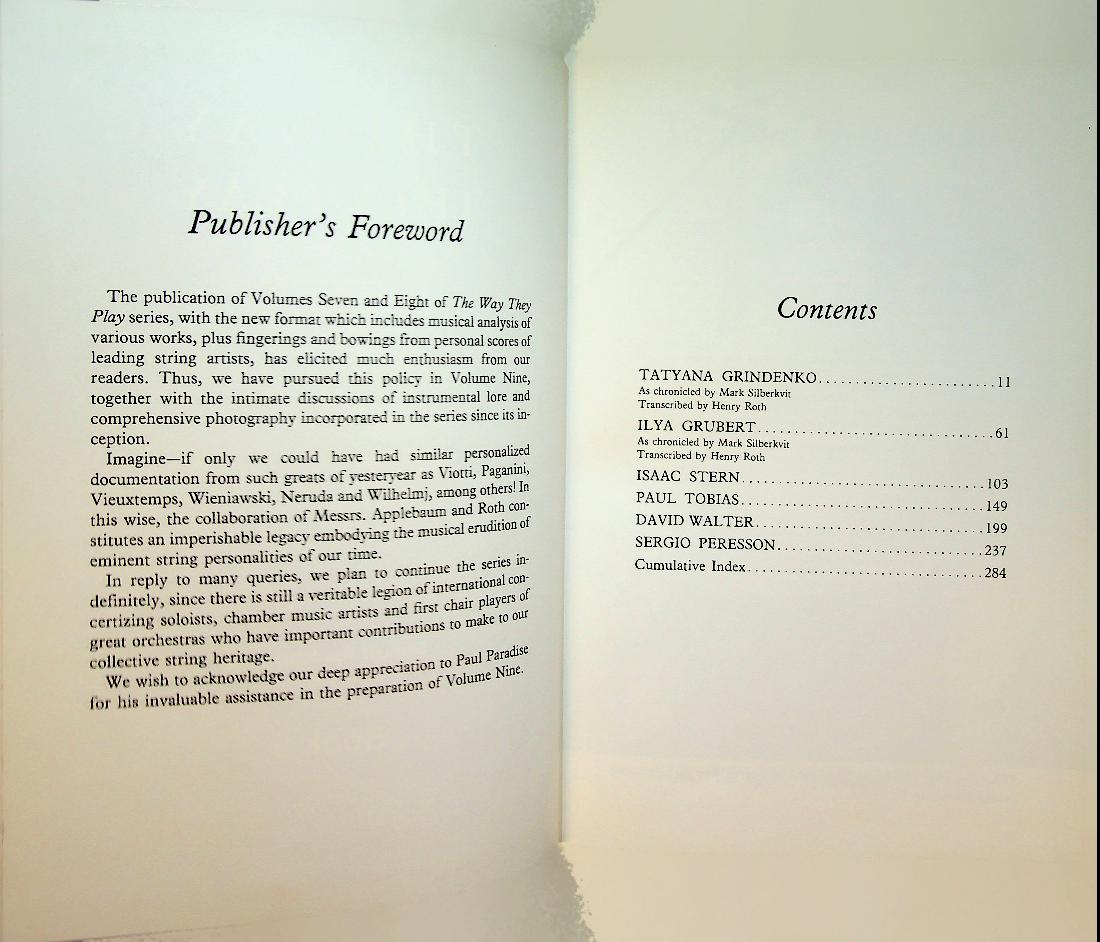 Applebaum, s. and H. Roth: 1981 USA, hardcover, 283 pages, illustrated, with index.The Way They Play, Book 9 presents in‑depth, illustrated interviews in which leading violinists and other string players such as Tatyana Grindenko, Ilya Grubert and Isaac Stern discuss their views on technique, interpretation, practice and musical development . This volume also includes contributions by Paul Tobias, David Walter and luthier Sergio Peresson, offering detailed, first‑hand insight into phrasing, sound production and pedagogy that makes it a valuable resource for advanced students, teachers and performers. ISBN 9780876665862 / 0876665865 In very good condition