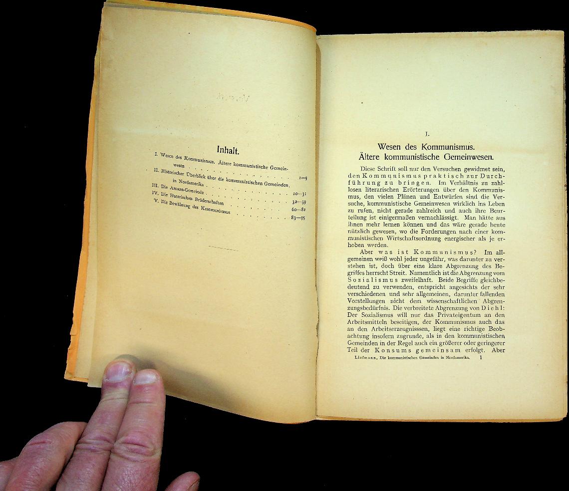 Liefmann, R: 1922 Jena, softcover 95 pages. Die Kommunistischen Gemeinden in Nordamerika by Liefmann is a historical study of 19th‑ and early 20th‑century communist and communal settlements in North America, such as religious and secular utopian communities. The author analyses their ideological foundations, economic organisation and social life, and discusses why some communities survived while others dissolved, positioning them within broader debates on socialism and communal experiments. In very good condition. German condition