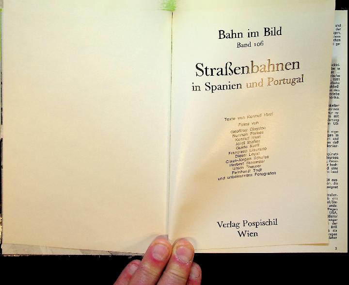 Hierl, K: 1984 Wien , hardcover, 124 pages, illustrated with photos. “Strassenbahnen in Spanien und Portugal” is a compact photo album and overview of the post‑war tramway systems on the Iberian Peninsula, covering the urban networks of Spain and Portugal with extensive illustrations and brief German captions. The book is volume 106 in the “Bahn im Bild” series and documents the surviving and former tramway operations in cities such as Lisboa, Porto, Sintra and Barcelona. In good condition. German language.