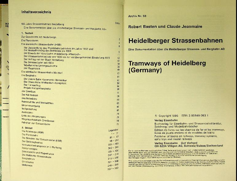 Basten, R and C. Jeanmaire: 1986 Verlag Eisenbahn Switserland, hardcover, 212 pages, illustrated with photos and design drawings. Richly illustrated centennial history of Heidelberg’s tramway and mountain railway company, covering its foundation, network development, vehicles and operations over 100 years. The book combines historical narrative with around 300 photographs and illustrations, making it both a reference work and a visual chronicle for tramway enthusiasts. ISBN 9783856490539 / 3856490531 In very good condition. German and English language