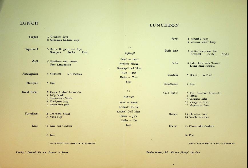 Menukaart SMN 1958 ms Oranje, ss Conrad