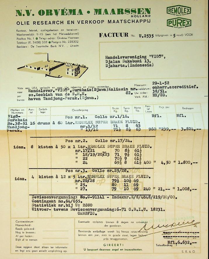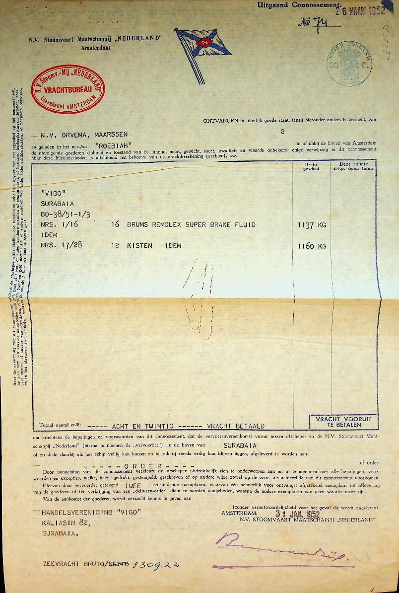 SMN: 1952 Amsterdam, voor 28 colli remvloeistof. + papieren leverancier en productiebedrijf Orvema Maarssen. In zeer goede staat