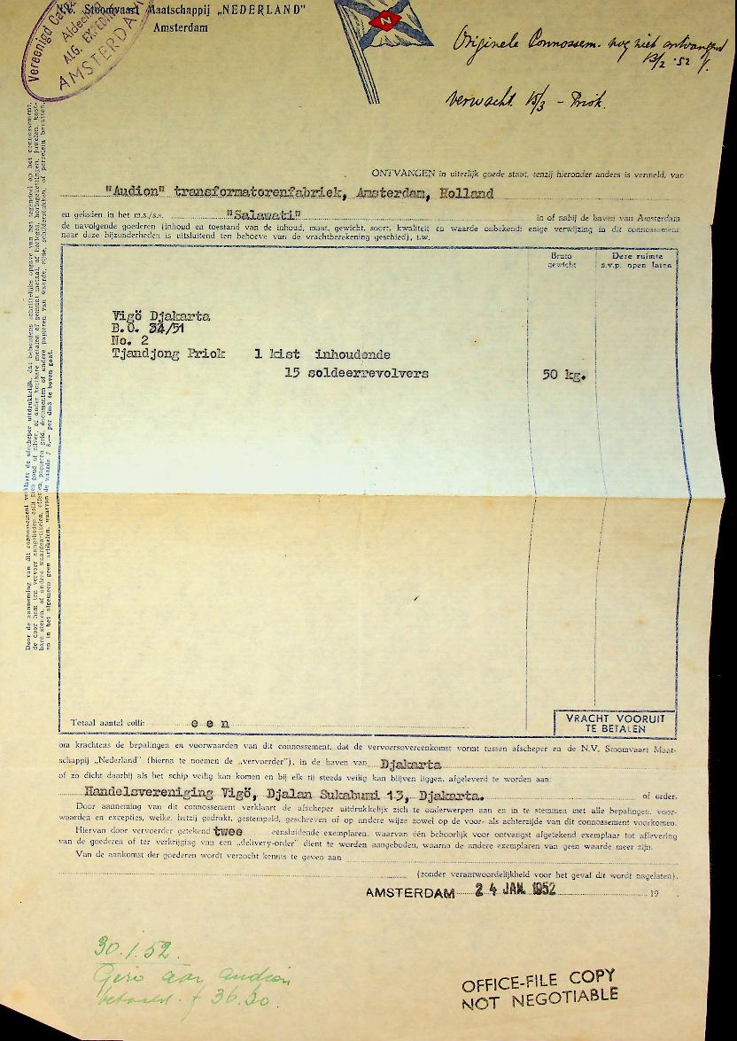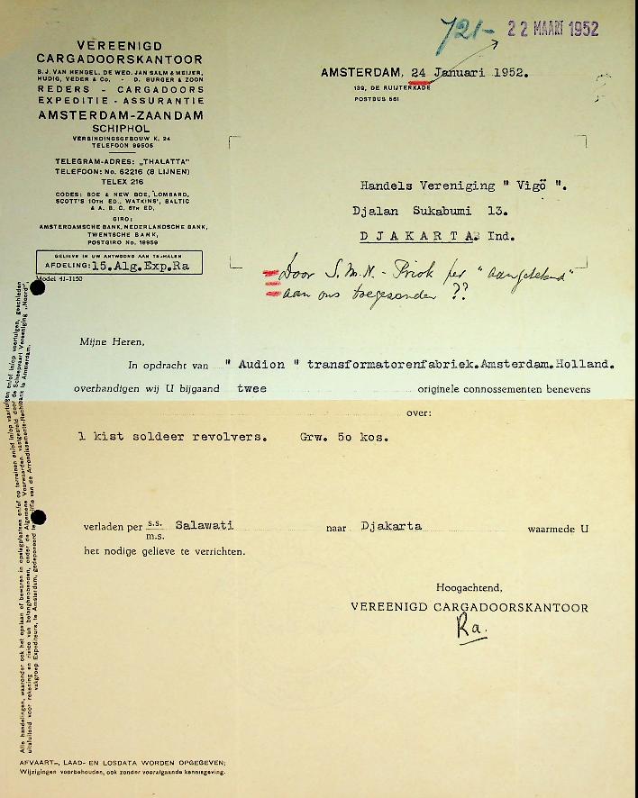 SMN: 1952 Amsterdam, voor het vervoer van 1 kist soldeerrevolvers naar Tandjong Priok. + formulieren van de producent Audion Transformatorenfabriek Amsterdam en het caragdoorskantoor