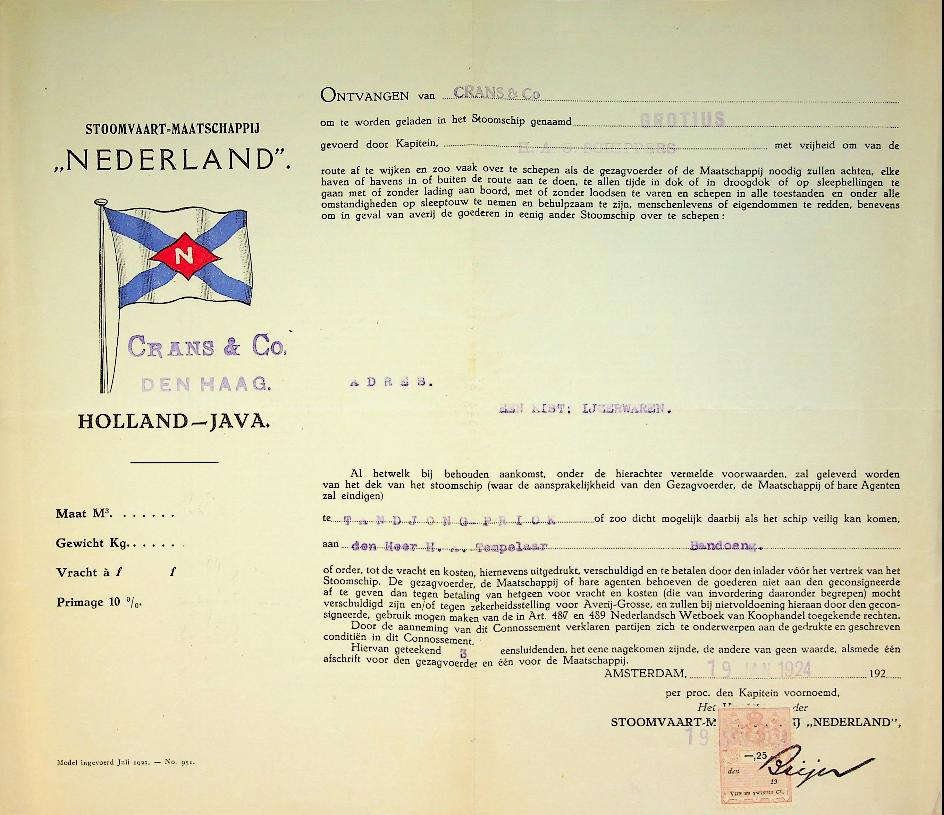 Vrachtbrief SMN ss Grotius 1924