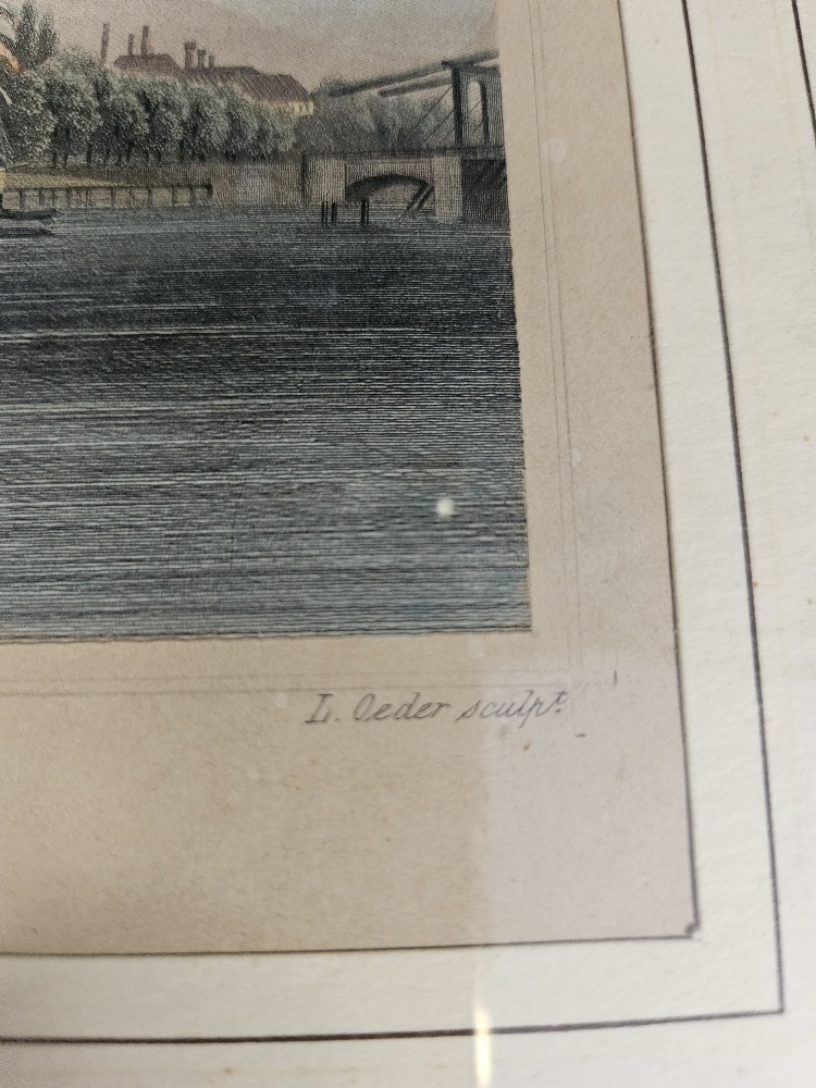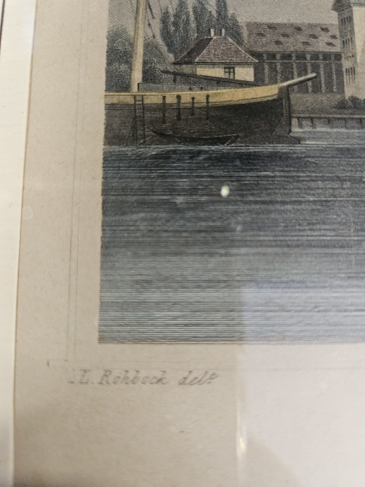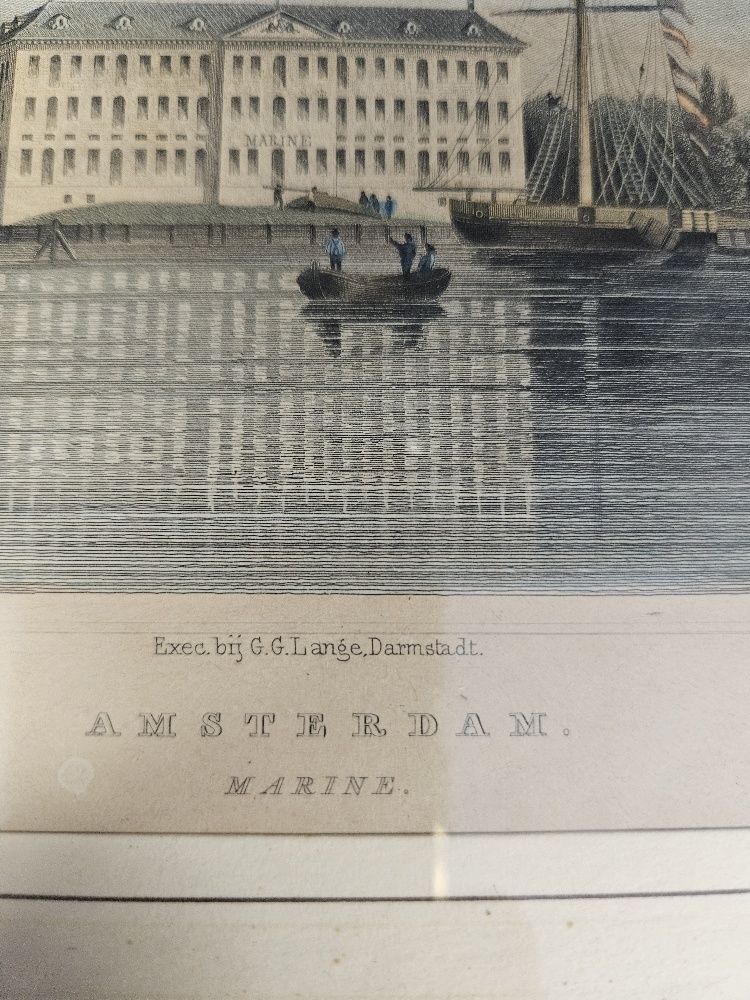Oeder, Ludwig: Fraai, met de hand ingekleurde lithografie van het Marine‑Magazijn (het huidige Scheepvaartmuseum) te Amsterdam, gezien vanaf het IJ, met diverse zeilschepen en een roeiboot op de voorgrond. Uitgevoerd door Ludwig Oeder, ca. 1840‑1860, en een mooi voorbeeld van 19e‑eeuwse maritieme topografie van de hoofdstad. De kleuren zijn nog fris, papier licht verouderd maar zonder storende beschadigingen; ingelijst in een eenvoudige, oudere houten lijst. Een aantrekkelijke prent voor liefhebbers van Amsterdam, maritieme historie en de marine. Ingelijst 27x23cm. In goede staat