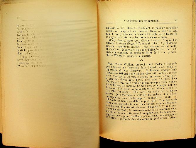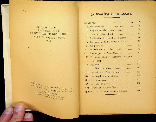 Mordal, Jacques: 1948 France, softcover, 191 pages, with maps. "A la Poursuite du Bismarck" by Jacques Mordal recounts the dramatic pursuit and ultimate sinking of the German battleship Bismarck by the British Royal Navy in May 1941, describing the strategic maneuvers and intense naval battles involved. The book provides a detailed, day-by-day account of the five-day chase across the Atlantic that captivated the world and marked a turning point in naval warfare during World War II. In very good condition. French language