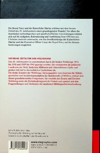 Jentzsch, C: 2018 Gruyter Berlin, hardcover, 623 pages. This study compares the British Royal Navy and the German Imperial Navy officer corps between 1871 and 1914, focusing on how they were recruited, educated, socialized and promoted from cadet to admiral. It shows how rapid technological and social change transformed both navies and forced their sea officers to adapt their training, professional self-image and career paths in the decades leading up to the First World War. ISBN 9783110604993 In very good condition