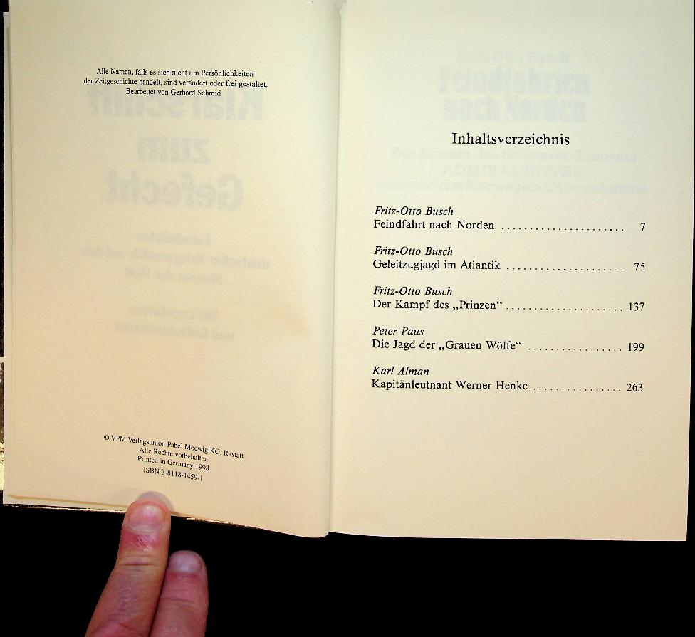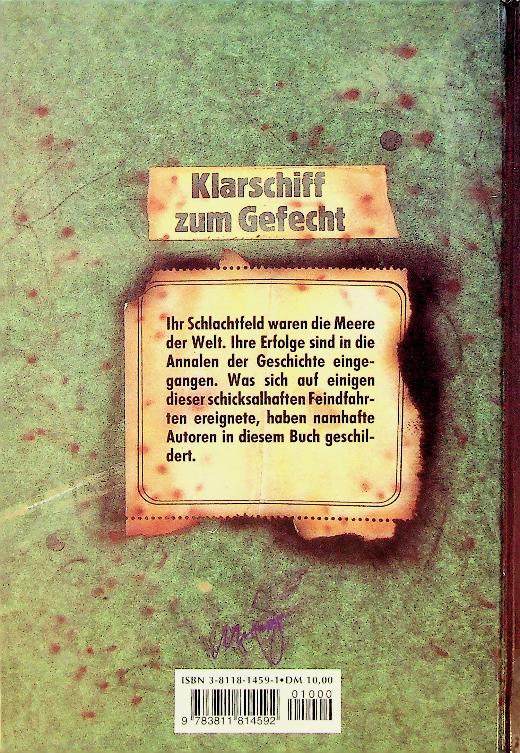 Busch, F.O.: 1998 Germany, hardcover, 335 pages. Klarschiff zum Gefecht. Feindfahrten deutscher Kriegsschiffe auf den Meeren der Welt is a popular history volume by Fritz-Otto Busch and co‑authors, recounting combat patrols and operations of German warships on various seas, mainly during the two World Wars. The book presents action‑oriented narratives of cruisers, destroyers and auxiliary raiders, focusing on dramatic engagements, long‑range missions and life on board. ISBN 9783811801318 In good condition. German language