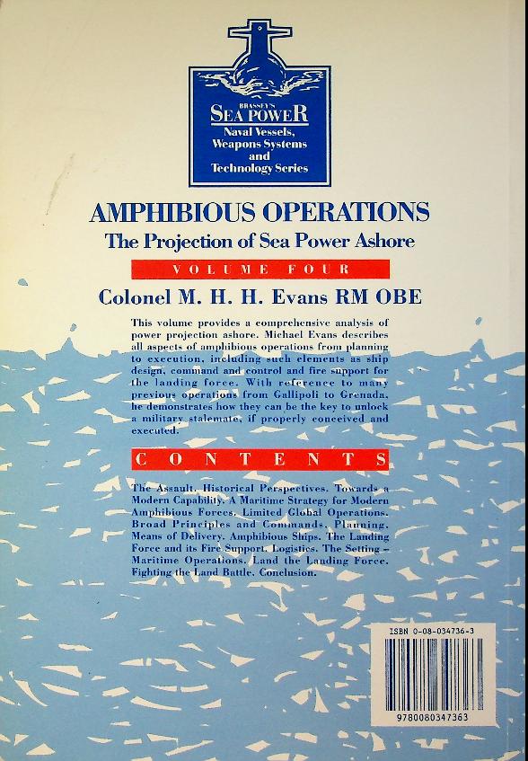 Evans, M.H.H.: 1990 Brassey's UK, softcover, 219 pages, illustrated. Amphibious Operations: The Projection of Sea Power Ashore explains the doctrine, planning and execution of modern amphibious warfare, focusing on how naval forces project combat power from sea to land. Volume 4 in the Brassey’s Sea Power series, it provides a concise professional overview of amphibious task forces, ship‑to‑shore movement and the integration of naval, land and air assets rather than a narrative campaign history. ISBN 9780080347370 In very good condition