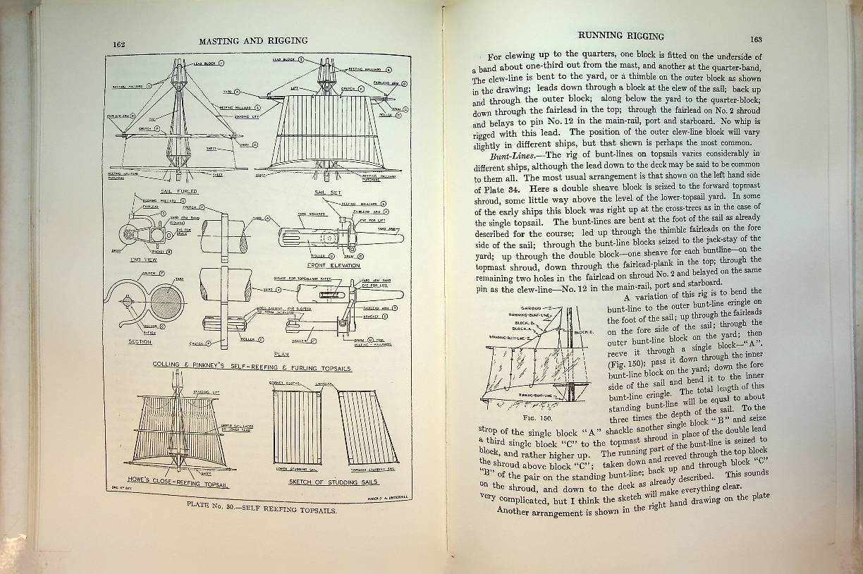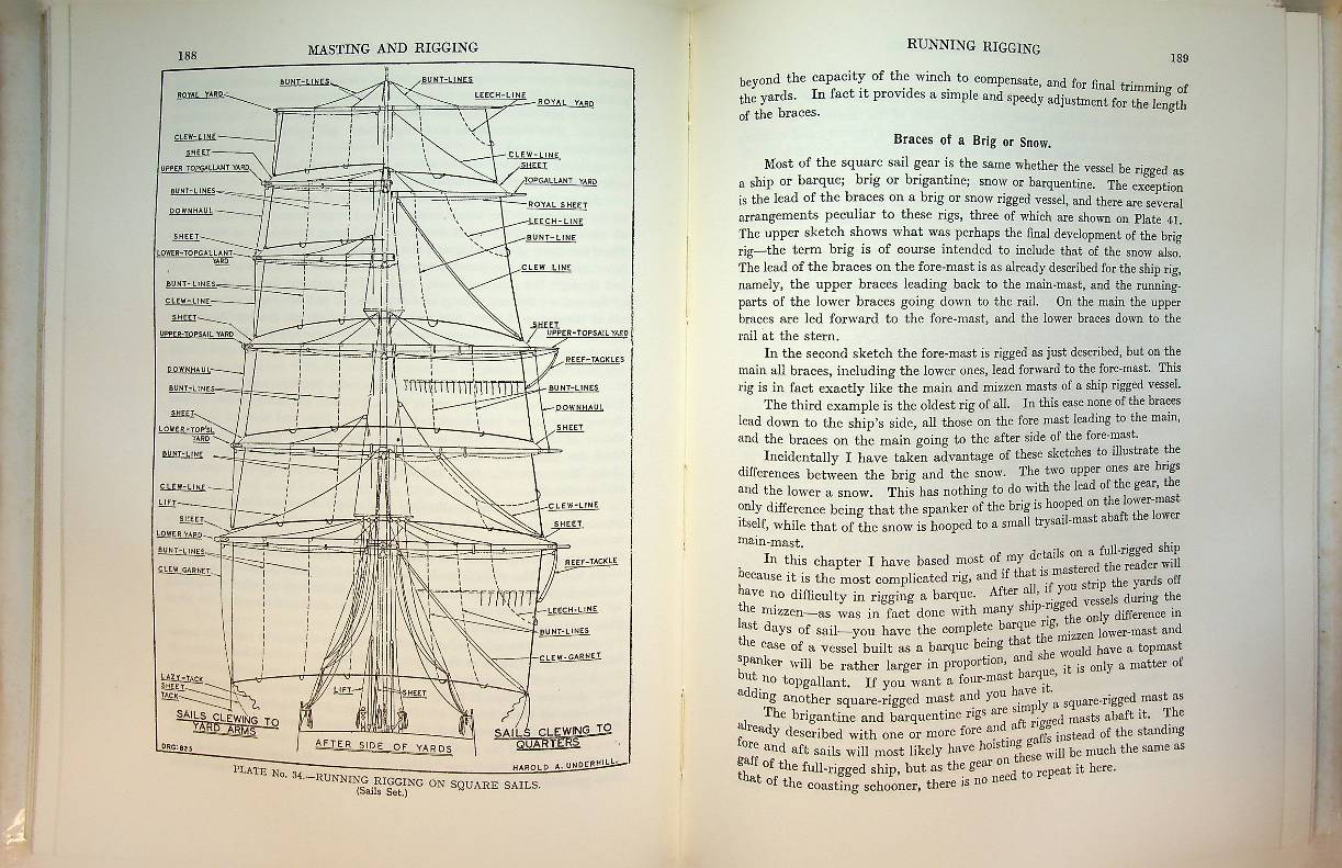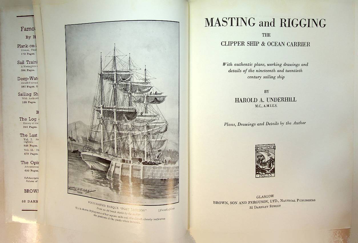 Underhill, Harold: 1976 Glasgow, hardcover with dust jacket 304 pages. With many detailed illustrations. A comprehensive exploration of the techniques and processes involved in rigging various types of square-rigged vessels, particularly focusing on clipper ships and ocean carriers. The book is richly illustrated with numerous working drawings and sketches, making it a valuable resource for ship modeling and understanding maritime engineering. In very good condition