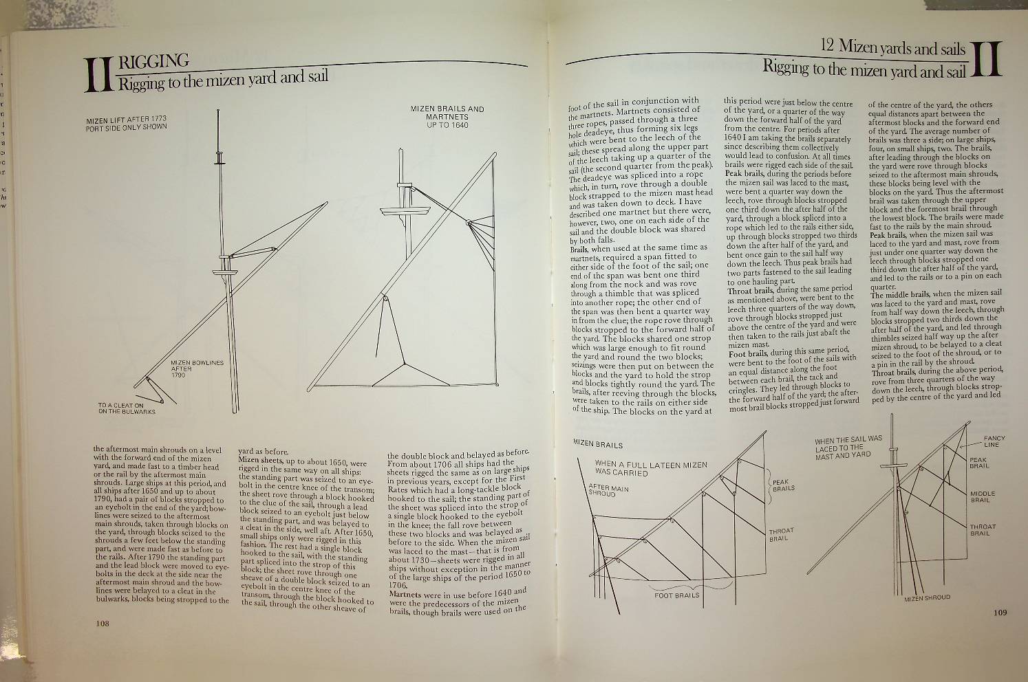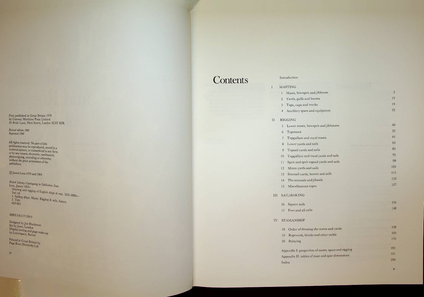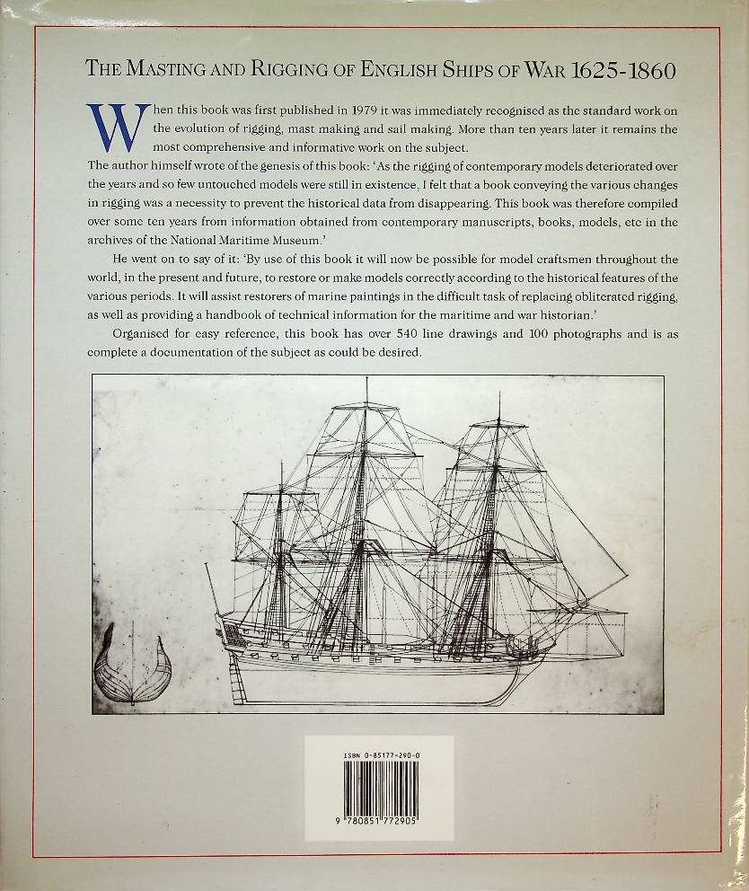 Lees, James: 1979 Conway Maritime Press UK, hardcover with dustjacket 196 pages. “The Masting and Rigging of English Ships of War 1625–1860” is a definitive, heavily illustrated reference that documents the construction, proportions, and evolution of masts, spars, sails, and both standing and running rigging in British warships across the age of sail, supported by over 540 line drawings, 100 photographs, and extensive dimensional tables compiled from National Maritime Museum sources. Intended as a technical handbook for historians, restorers, and modelmakers rather than casual readers, it standardizes period-correct practices, belaying, and sequences of rigging work to enable accurate restoration and modeling of Royal Navy square‑rigged ships. ISBN 9780870219481 small marks of use. In good condition