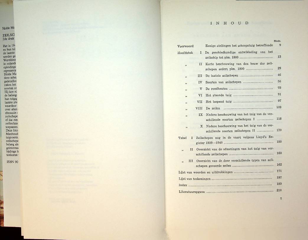 Manhoudt Hidde. Jr.: 1946, hardcover met papieromslag. Uitgebreide beschrijving van de constructie en het tuigagesysteem van zeilschepen, met een focus op diepwaterzeilschepen vanaf het jaar 1800. Het boek bevat gedetailleerde beschrijvingen, foto's, plannen en schema's om de lezer een diepgaand inzicht te geven in de technische en historische aspecten van zeilschepen. Met index en woordenlijst. ISBN 9789022818381 / 9022818381. In zeer goede staat