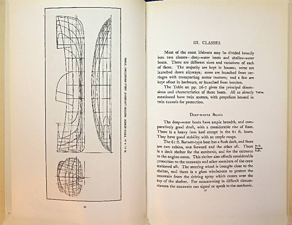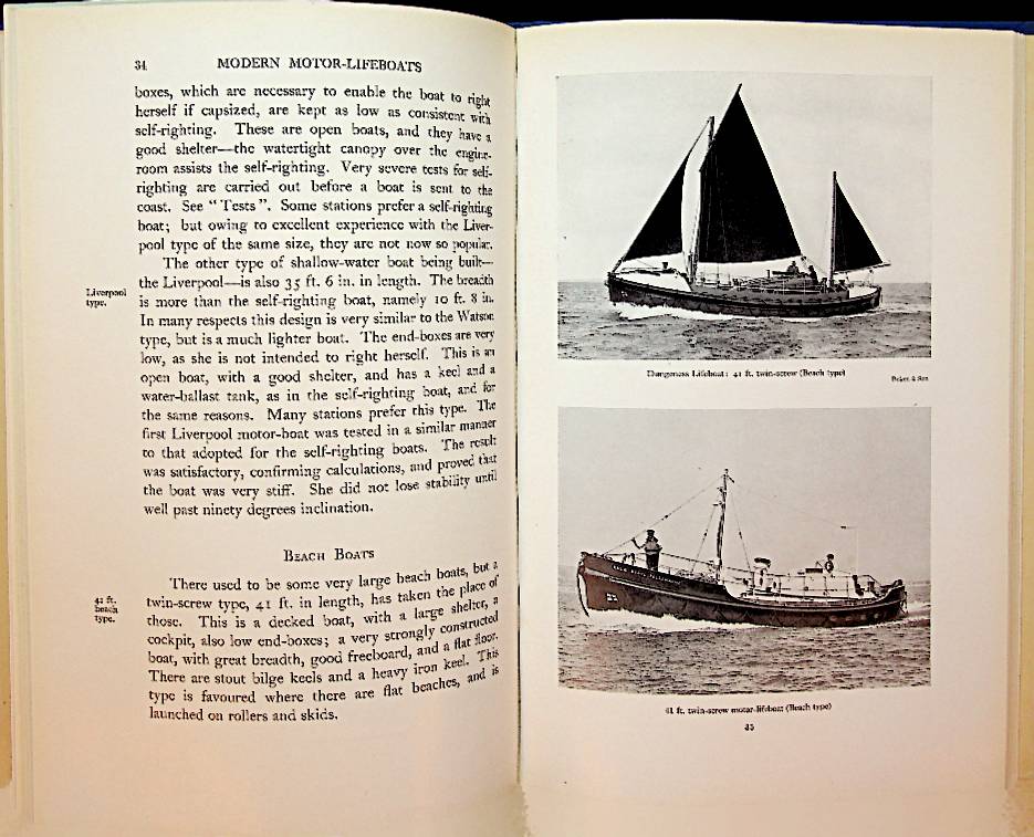 Barnett, J.R.: 1950 London, hardcover 78 pages, with photos and plans of the lifeboats. The generation lifeboats, design, classes, construction etc. "Modern Motor-Lifeboats" by Barnett provides a detailed overview of the development and design of motor lifeboats, classifying them into categories such as deep-water and shallow-water boats and explaining the rigorous testing procedures they undergo. The book highlights the technological advancements introduced by the Royal National Lifeboat Institution’s motor lifeboats and the impact of these innovations on maritime rescue operations. In very good condition
