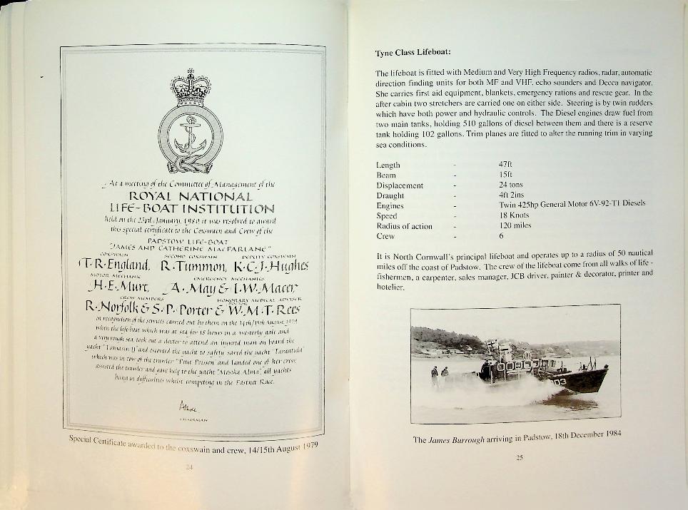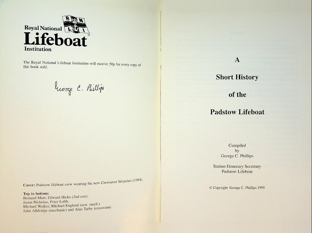 Philips, G.C.: 1995 UK, softcover, 46 pages, illustrated. A Short History of the Padstow Lifeboat by George C. Phillips is a concise, locally published history outlining Padstow’s lifeboat station from its early 19th‑century origins through notable rescues and tragedies, including capsizes in 1867 and 1900 that claimed crew lives amid the hazardous Doom Bar and North Cornwall coast conditions. It highlights Padstow’s claim as one of Cornwall’s earliest stations (established in 1827 under RNLI auspices by 1856), describing the evolution from pulling and sailing boats to later steam and motor craft serving Hawker’s Cove and, eventually, Trevose Head. In good condition.