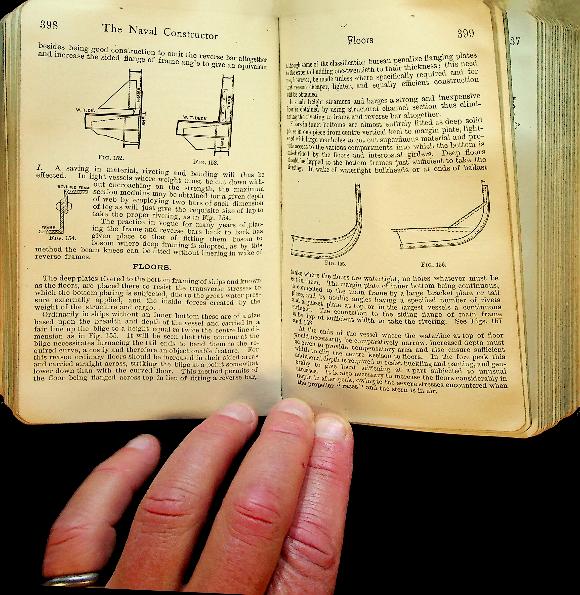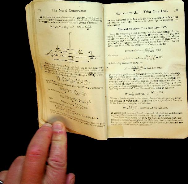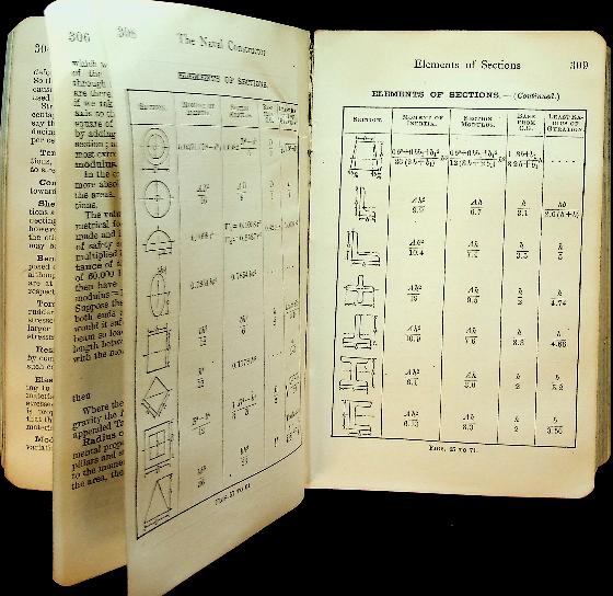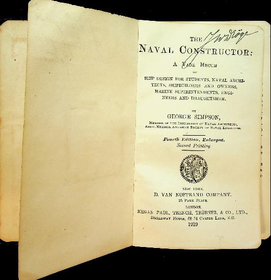 Simpson, G: 1919 USA, hardcover, 880 pages, illustrated. The Naval Constructor is a concise, highly practical handbook that distills core principles of naval architecture—displacement, hydrostatics, stability, strength, freeboard, and standardized fittings—into ready-reference formulas, tables, and worked examples for students and working ship designers circa the early 20th century. Simpson emphasizes calculation methods (notably Simpson’s Rule), design procedures, ventilation, equipment standards, and comprehensive mathematical tables, aiming to eliminate obsolete data and align practice with then-current rules for merchant and naval ship design. In good condition