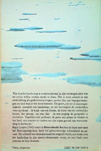 Lopez, B: 1986, softcover, 389 blz., met foto's en kaarten. Droombeeld Arctica van Barry Lopez is de Nederlandse uitgave van zijn Arctica-boek, waarin hij reizen, natuurhistorie, cultuur en verbeelding verweeft tot een essayistische zoektocht naar het Noordpoolgebied en onze projecties daarop. Lopez onderzoekt hoe mythen, expedities en landschapsobservaties samen het beeld van de Arctica vormen, en plaatst menselijke verlangens naast de ecologische werkelijkheid van het hoge noorden. ISBN 9789020424898 / 9020424890 In goede staat