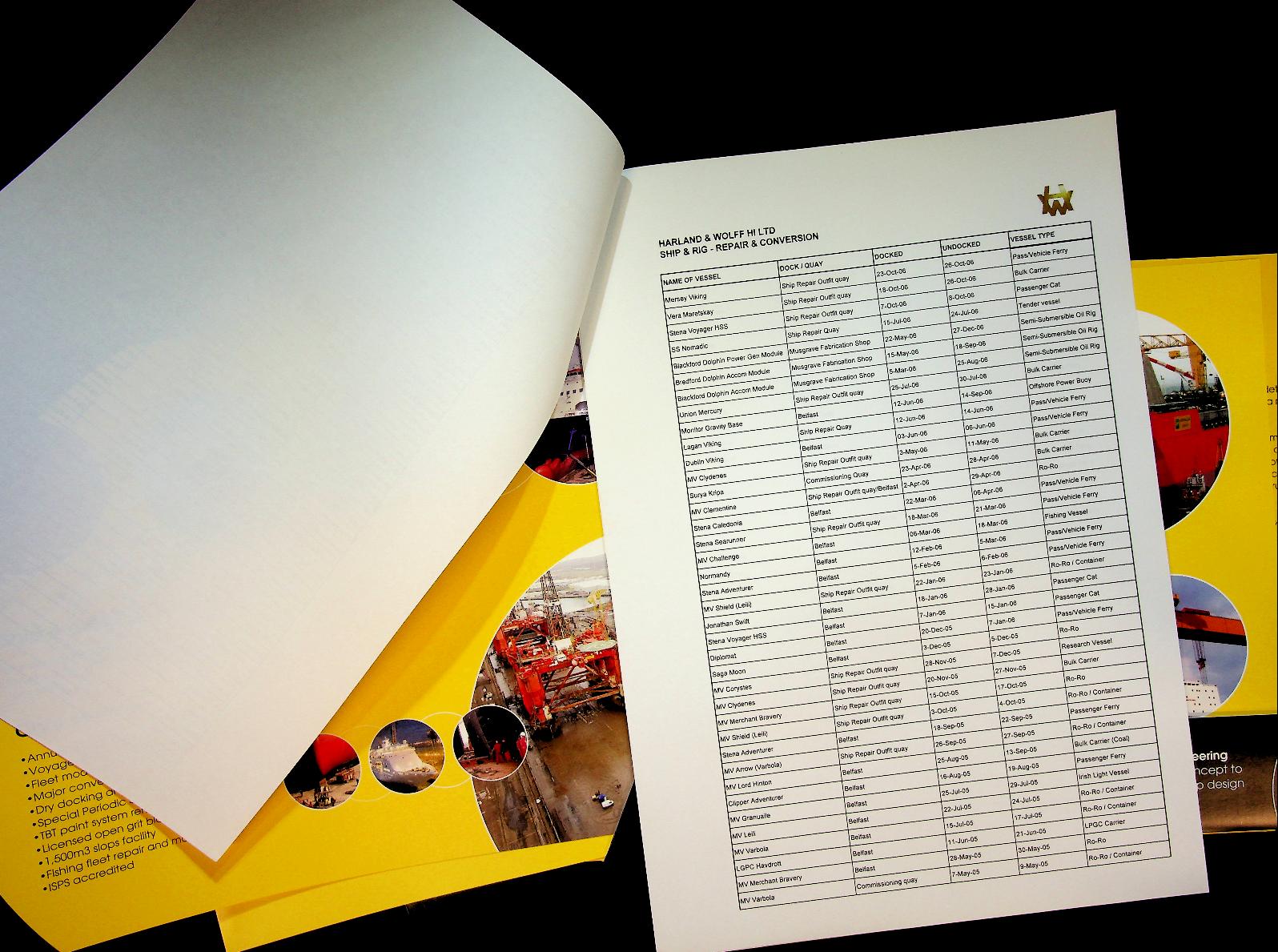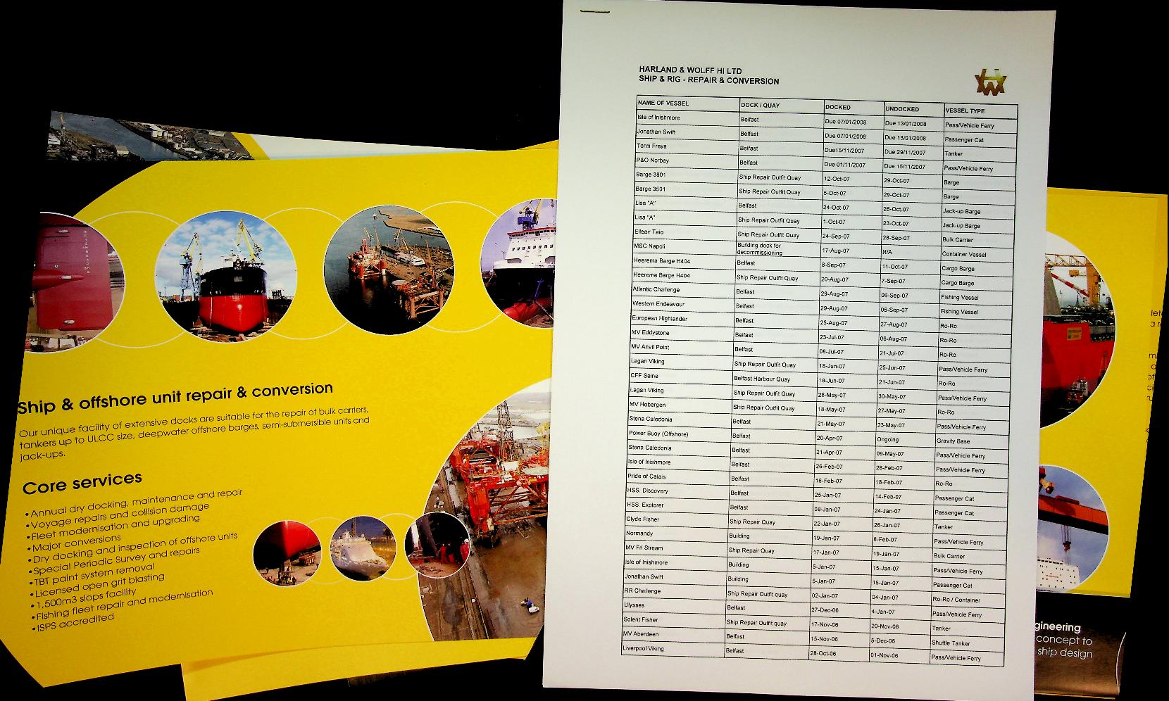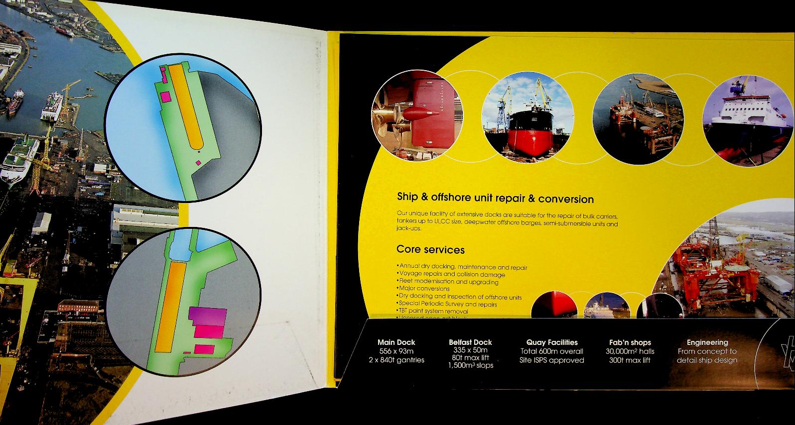 Harland and Wolff, softcover map with 6 sheets and list of ships who were repaired or had an conversion between 2005 and 2008, with details. Sheets with photos and information. In very good condition