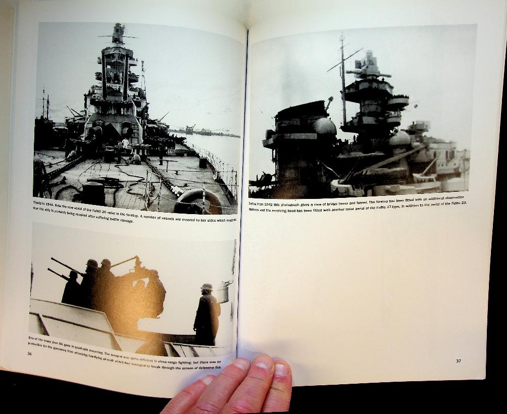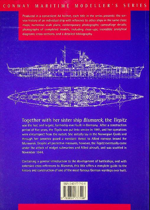 Koop, G. and K.P. Schmolke: 1998 Conway Maritime Press, softcover, 56 pages, with detailed photos and design drawings. Compact, model‑oriented monograph that traces the design, construction and operational history of the German battleship Tirpitz, sister ship to Bismarck, supplemented with numerous photographs, drawings and technical data for ship modellers. The book places particular emphasis on the ship’s modifications, camouflage schemes and fittings over time, enabling readers to recreate Tirpitz accurately in scale form while also outlining her deployment in Norwegian waters and eventual destruction in 1944. ISBN 9780851777498 In very good condition