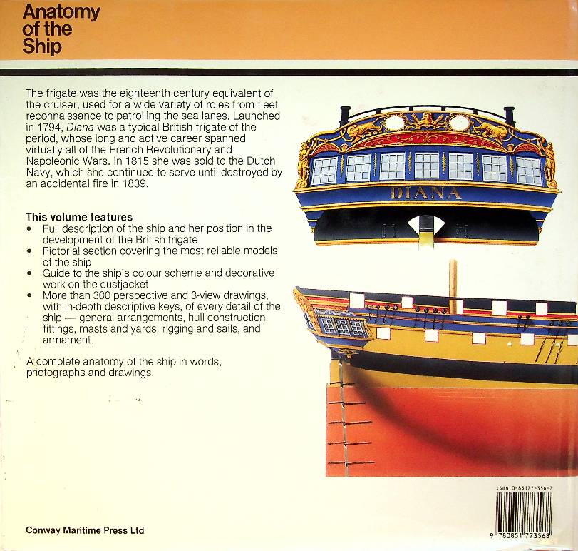 White, David: 1987 London, hardcover with dustjacket 120 pages, with all the details of the ship for ship modelling. “The Frigate Diana” by David White is a detailed technical and visual study of the 1793–94 British frigate Diana, covering her design, construction, armament, rig, and service through the French Revolutionary and Napoleonic Wars before her sale to the Dutch Navy in 1815 and loss by accidental fire in 1839. Part of the Anatomy of the Ship series, it features over 100 perspective and 3D drawings, extensive plans, photographs of models, and descriptive keys, making it a core reference for Age of Sail enthusiasts and modelers. ISBN 9780851773568 In good condition