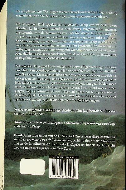 Grann, D: 2023, softcover, 376 blz., geïllustreerd. De schipbreuk van The Wager van David Grann vertelt het waargebeurde, bloedstollende verhaal van het Britse oorlogsschip HMS The Wager dat in 1741 vergaat voor de kust van Patagonië, waarna de overlevenden op een onbewoond eiland belanden en onder barre omstandigheden moeten zien te overleven, wat leidt tot muiterij, verraad en een strijd op leven en dood. Na terugkeer in Engeland ontstaat een juridisch conflict over wat er precies is gebeurd, waarbij overlevenden elkaar beschuldigen van moord en verraad, en de Britse marine een krijgsraad instelt om de waarheid vast te stellen. Het lot van de bemanningsleden hangt letterlijk aan een zijden draadje. ISBN 9789021480480 In zeer goede staat