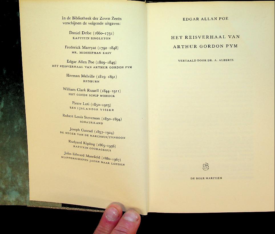Edgar Allan Poe: 1978 Bussum, hardcover papieromslag 228 blz.. Het reisverhaal van Arthur Gordon Pym is de Nederlandse titel van Edgar Allan Poe’s enige voltooide roman, waarin de jonge Arthur Gordon Pym als verstekeling aan boord van een walvisvaarder terechtkomt en achtereenvolgens te maken krijgt met muiterij, schipbreuk, honger en zelfs kannibalisme. Uiteindelijk wordt hij gered door de schoener Jane Guy en gaat de reis verder richting onbekende eilanden en het verre Zuidpoolgebied, waarbij het verhaal zich ontwikkelt van een realistisch zee avontuur tot een steeds fantastischer en beklemmender ontdekkingsreis naar het onbekende. ISBN 9789022816240 / 9022816249 In goede staat