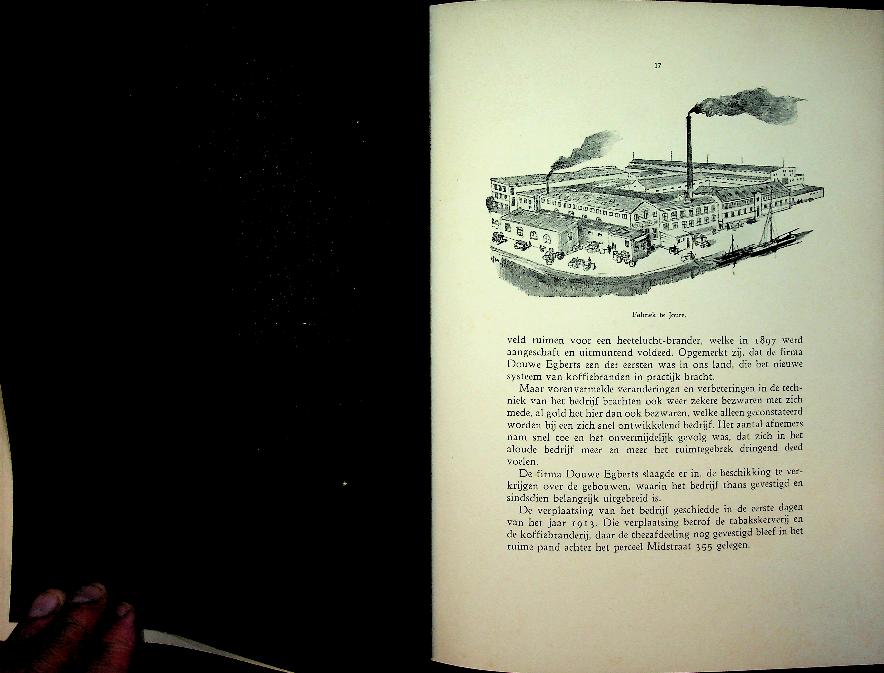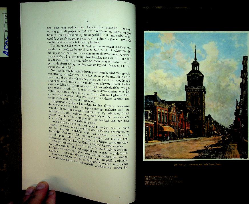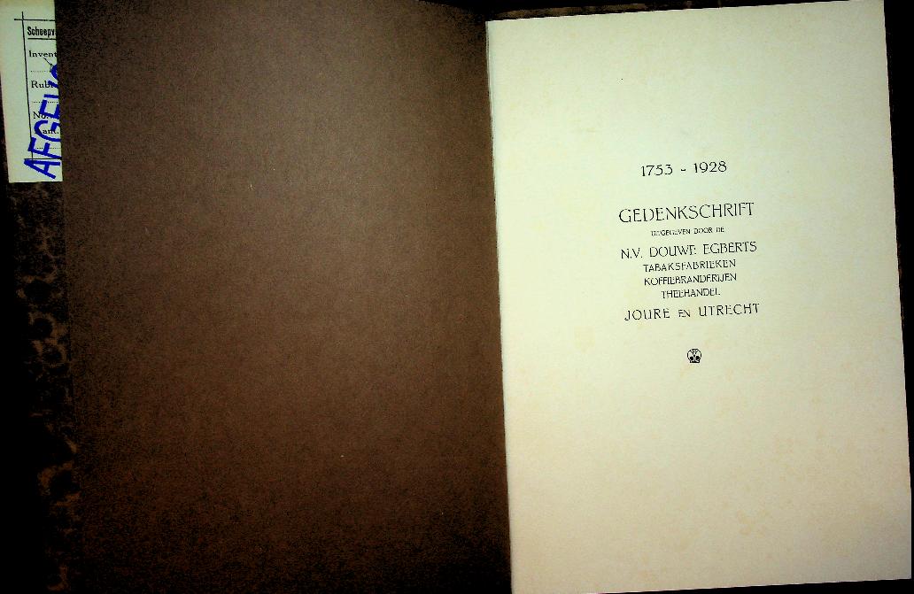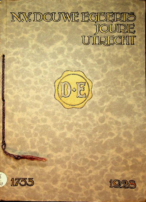 Wijnand, J.C.: 1928 Joure, softcover, binding met koord, 48 blz., geïllustreerd. gedenkschrift ter gelegenheid van het 175‑jarig bestaan, dat de ontwikkeling schetst van de winkel “De Witte Os” in Joure (1753) tot een moderne N.V. met tabaksfabrieken, koffiebranderijen en theehandel in Joure en Utrecht in 1928. Het beschrijft de familie- en bedrijfscontinuïteit, de groei buiten Joure onder Douwe Egberts, en de strategische Utrechtse vestiging (vanaf 1919) als mijlpalen in de transformatie van regionaal handelshuis naar landelijk merk. In zeer goede staat
