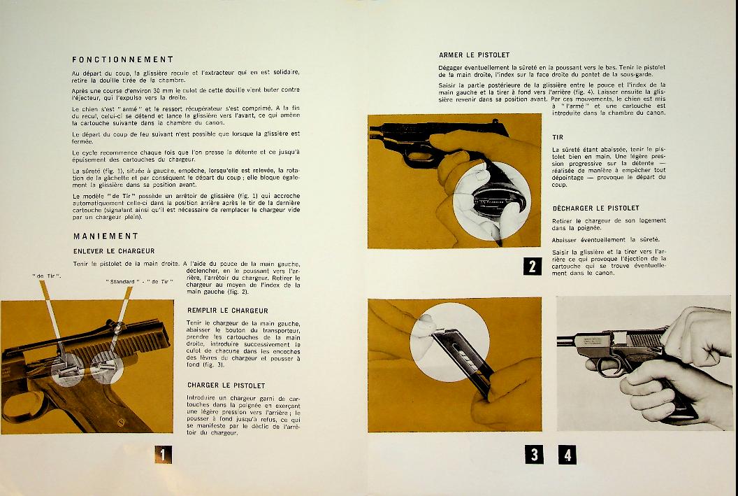 FN: Herstal Liege Belgium 1962, softcover folding-out 10 pages, with photos of the weapon, how to handle and large drawing with numbered parts. In very good condition. French language. rare!