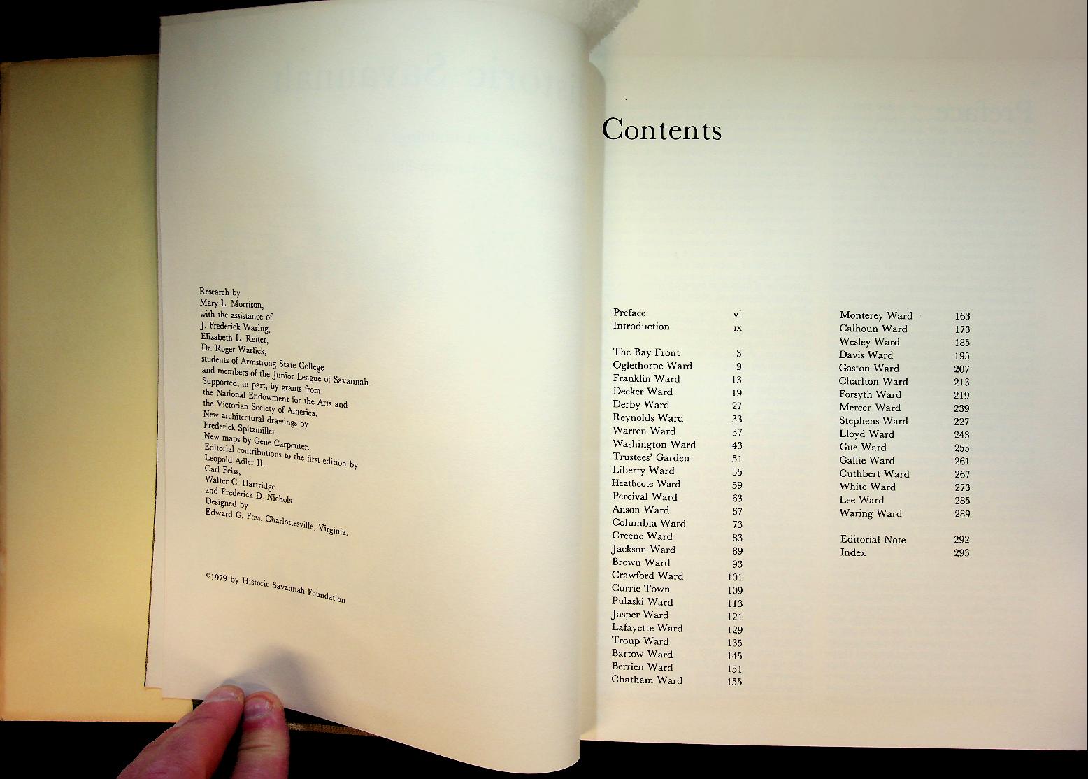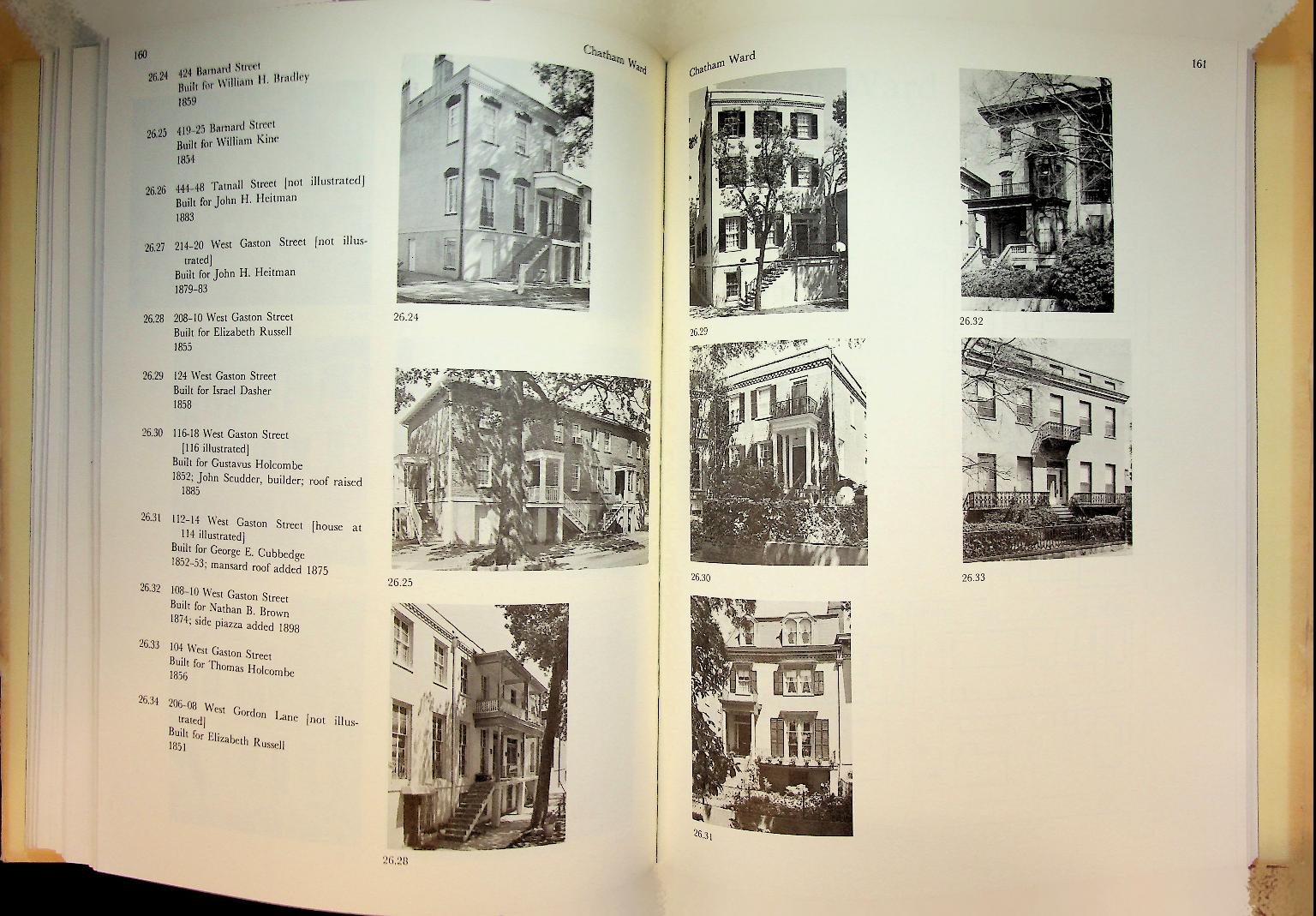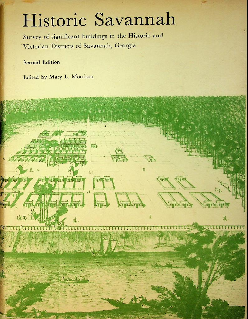 Morrison, Mary L.: 1979 Historic Savannah Foundation second edition, hardcover with dustjacket 299 pages, with index to the buildings. All the buildings and houses on photo with detailed description. “Historic Savannah; A Survey of Significant Buildings in the Historic and Victorian Districts of Savannah, Georgia” is an illustrated reference work that documents the architecture, construction dates, and historical significance of buildings throughout Savannah’s historic and Victorian districts, compiled from extensive archival and tax-record research. The book serves as a foundational guide for historians, preservationists, and tour guides, and is often informally referred to as the “Savannah Bible” because of its authoritative coverage of nearly every historic property in downtown Savannah. In very good condition