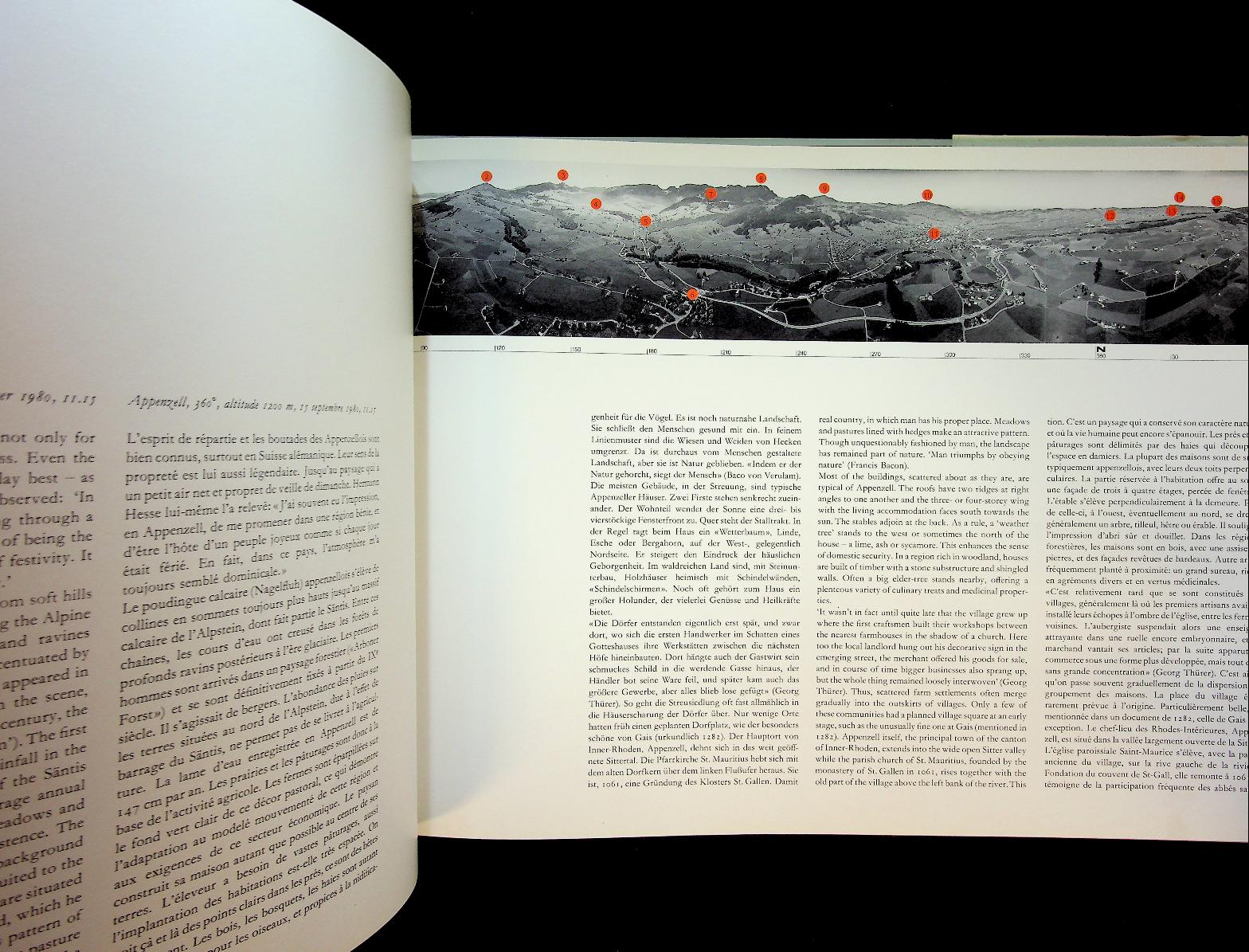 Schulthess, Emil: 1982 Artemis Zurich, hardcover with dustjacket 203 pages. Beautiful panorama of landscapes, city's and mountain's in folding-out pages, with detailed texts about the photo's. Beautiful large book. Swiss Panorama is a large-format photo book by Emil Schulthess featuring 360-degree panoramic aerial views of Swiss landscapes, cities, lakes and mountains. It includes fold-out panoramas with captions explaining the photographic techniques and the locations shown. 9783760805832 / 3760805833 In very good condition Because of weight no sending outside Europe, or some additional costs)