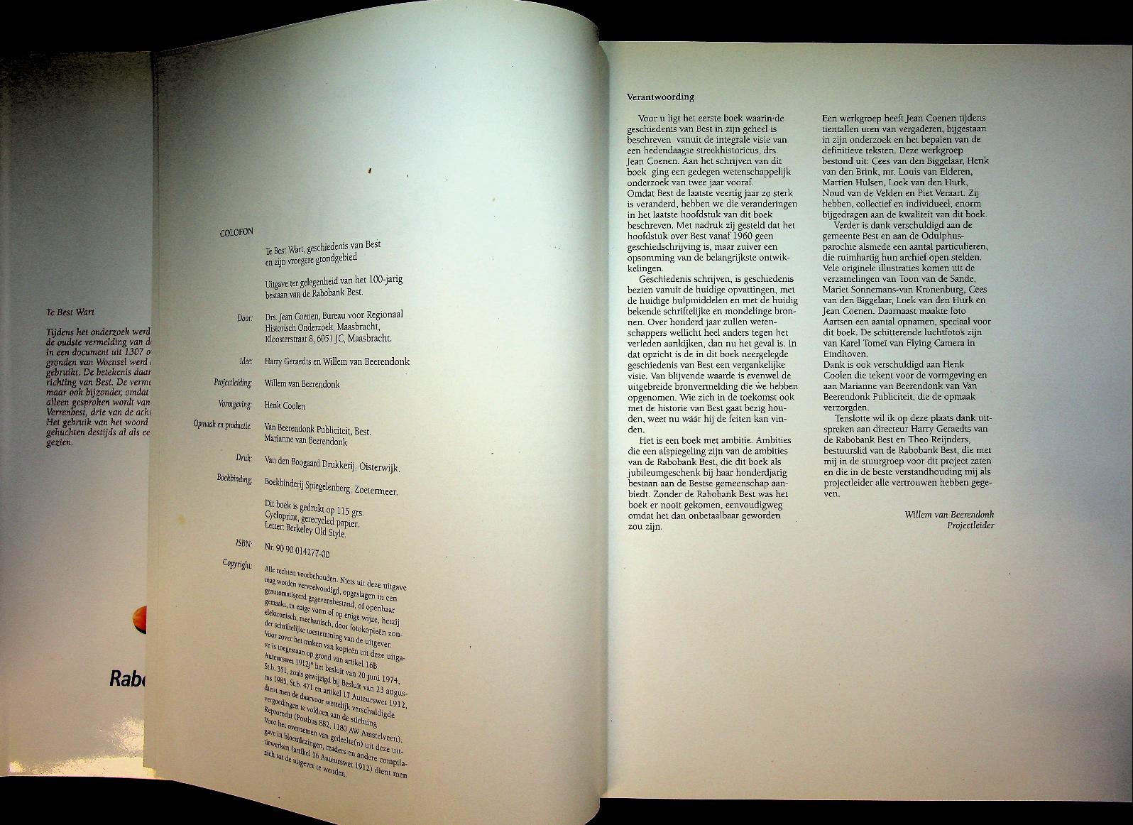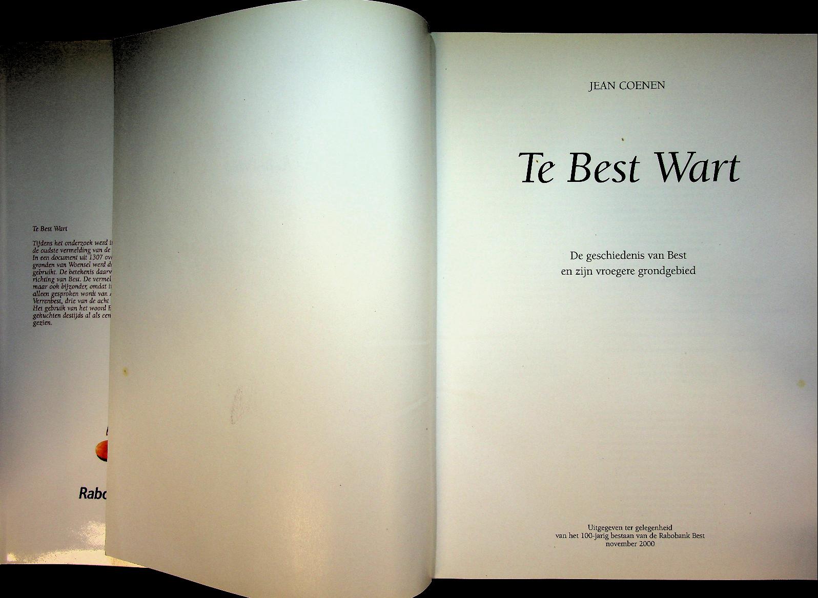 Coenen, J: 2000 Best, hardcover met papieromslag 431 blz., met foto's en aero foto's van het gehele grondgebied in detail. Te Best Wart van Jean Coenen beschrijft in detail de geschiedenis van de gemeente Best en haar vroegere grondgebied, met veel aandacht voor sociale, economische en landschappelijke ontwikkelingen vanaf de vroegste bewoning tot de moderne tijd. Het rijk geïllustreerde boek verscheen in 2000 ISBN 909001427700 In zeer goede staat