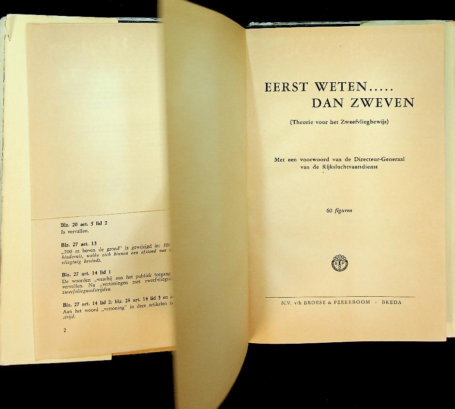 Collectief: 1959 Breda, hardcover met papieromslag, 166 blz., met illustraties. Eerst weten, dan zweven (1959) is een Nederlandstalig studieboek dat stap voor stap de theorie achter het zweefvliegen behandelt ter voorbereiding op het zweefvliegbewijs. Het legt de aerodynamica, bedienings- en vluchtprincipes en basismeteorologie uit, zodat beginnende zweefvliegers veilig en verantwoord praktijklessen kunnen volgen. In zeer goede staat