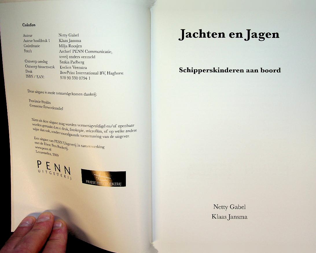 Gabel, Netty en klaas Jansma: softcover 176 blz., met foto's. Jachten en jagen van Netty Gabel en Klaas Jansma bevat historische, waargebeurde verhalen over het leven van schipperskinderen aan boord in Friesland, waarbij hun dagelijks leven, schoolgang en spel centraal staan. Het boek schetst een beeld van de ontwikkeling van de binnenvaart en de soms harde, maar hechte leefwereld van varende families in de twintigste eeuw. ISBN 9789033007941 Binnenvaart