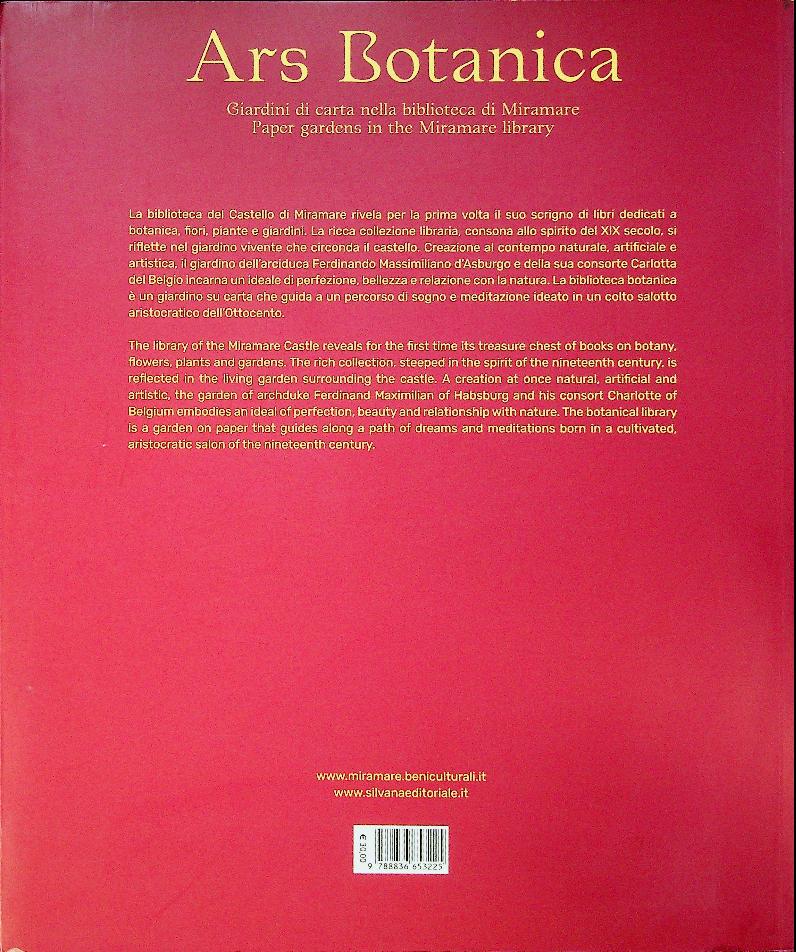 Contessa, A: 2023 Italy, softcover, 161 pages, illustrated. Ars Botanica is the exhibition catalogue by Andreina Contessa for Miramare Castle in Trieste, presenting the castle library’s 19th‑century botanical treasures through over a hundred works and more than 2,000 images that chart the art and science of botany, gardens, and plant illustration. It frames this “paper garden” in dialogue with the living park created by Archduke Maximilian of Habsburg and Charlotte of Belgium, highlighting their travels, collecting, and aesthetic ideas that shaped the history of botanical illustration as a meeting point between scholarship and beauty. ISBN 9788836653225 In very good condition. Italian-English Language