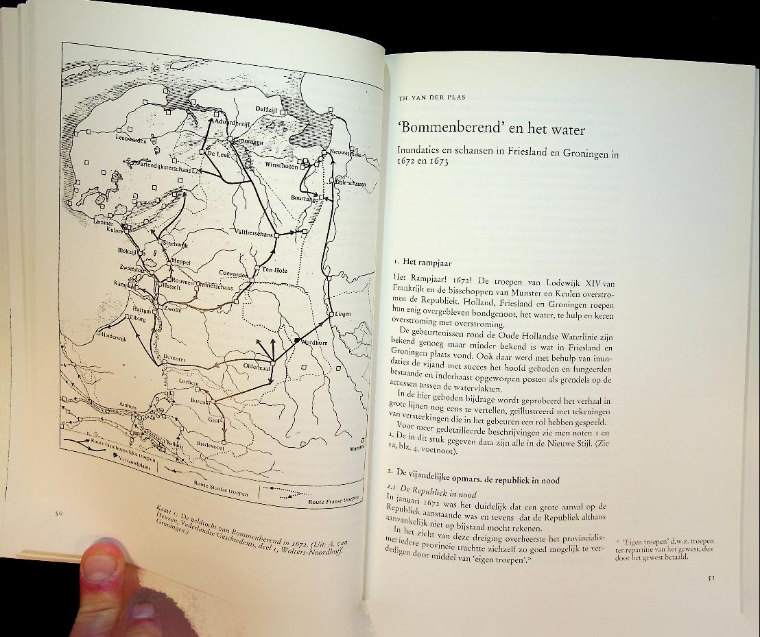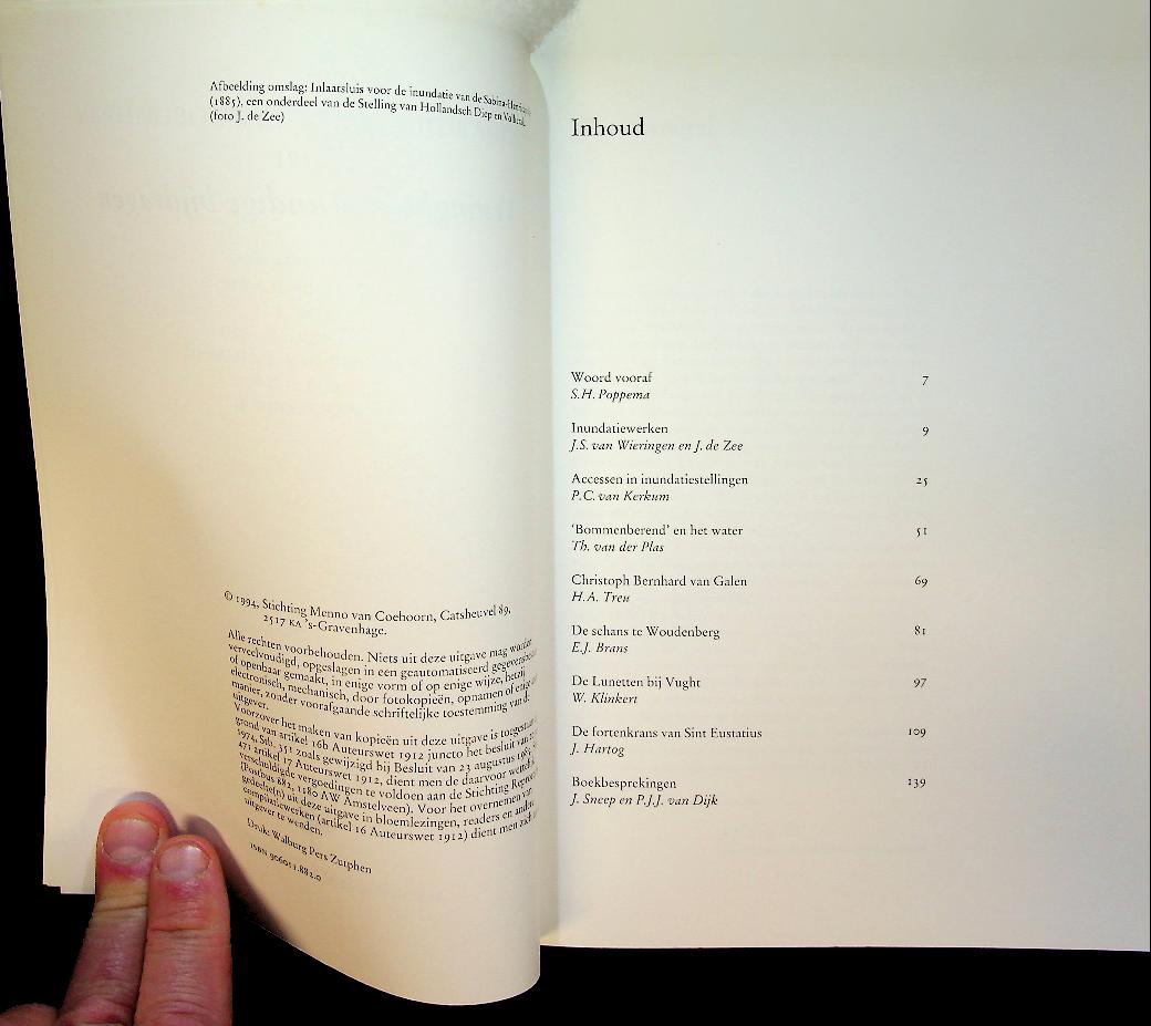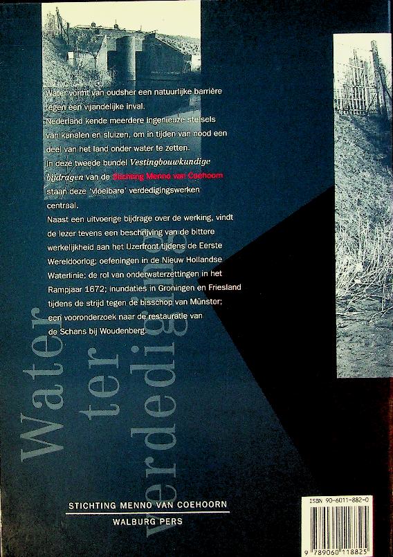 Poppema, S.H. e.a.: 1993 Walburgpers, softcover, 160 blz., geïllustreerd. Water ter verdediging, onder redactie van S.H. Poppema, bundelt vestingbouwkundige bijdragen uit 1993 over de rol van water als verdedigingsmiddel in Nederlandse fortificaties, met bijzondere aandacht voor waterlinies, inundaties en de bijbehorende werken. Het boek behandelt in tekst en illustraties hoe water als kunstmatig gestuurd obstakel werd ingezet in landschap en vestingbouw, en plaatst verschillende linies en verdedigingswerken in hun historische en militaire context. ISBN 9789060118825 In zeer goede staat