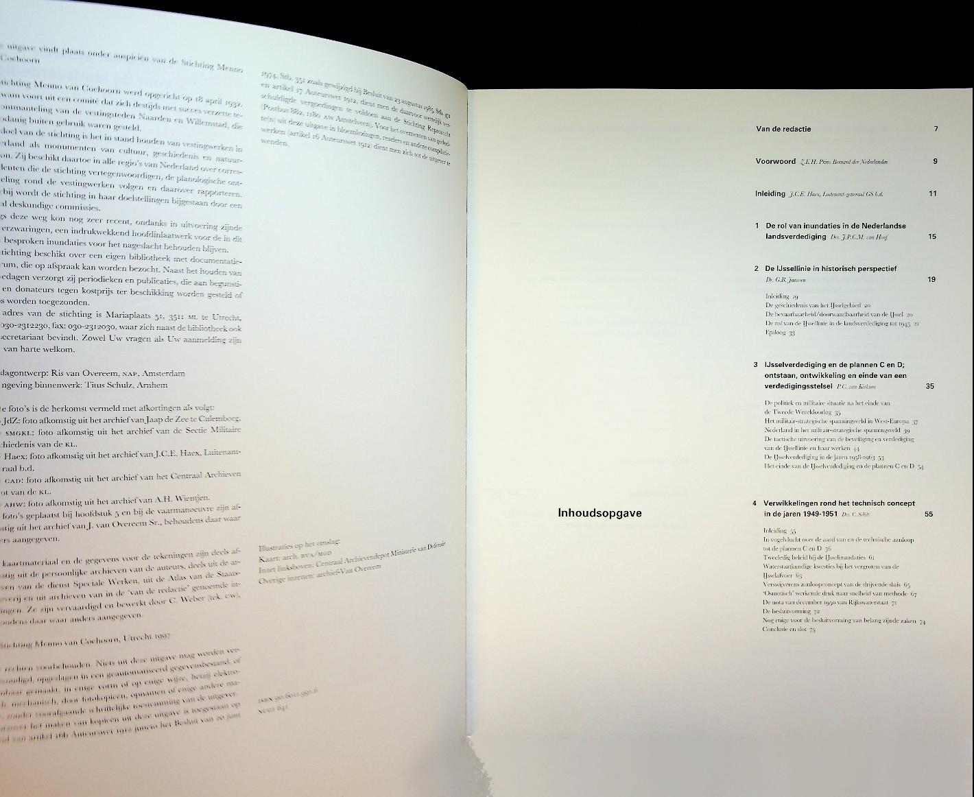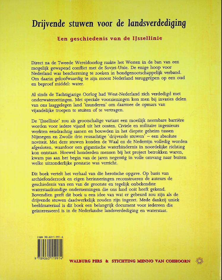 Beekmans, J.R.: 1997 Utrecht Menno van Coehoorn, softcover, 207 blz., geïllustreerd. Het boek beschrijft hoe na de Tweede Wereldoorlog een enorme, maar relatief onbekende waterstaatkundige verdedigingslinie langs de IJssel werd aangelegd, waarbij drijvende stuwen hele riviertrajecten moesten kunnen inunderen om een Sovjetaanval te stoppen. Op basis van archiefonderzoek, herinneringen van betrokkenen en rijk beeldmateriaal reconstrueren Beekmans en Schilt de technische, militaire en politieke context van dit project en laten zij zien wat er gebeurd zou zijn als deze stuwen daadwerkelijk in oorlogstijd waren ingezet. ISBN 9789060119914 In zeer goede staat