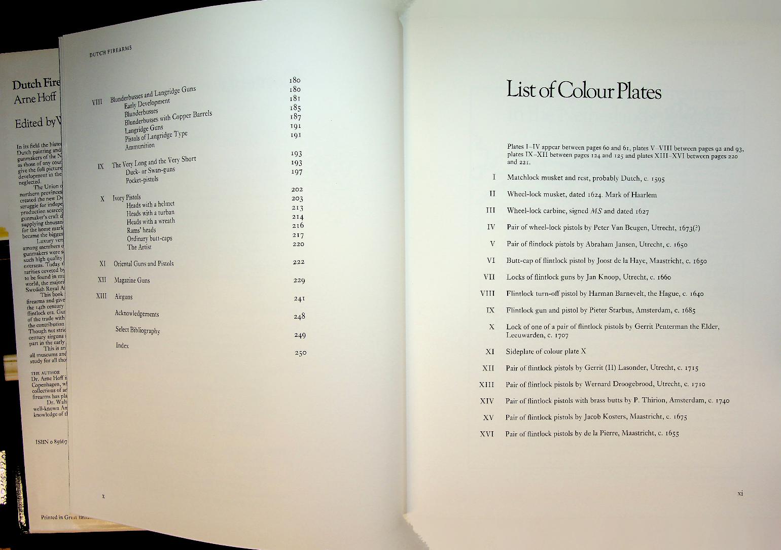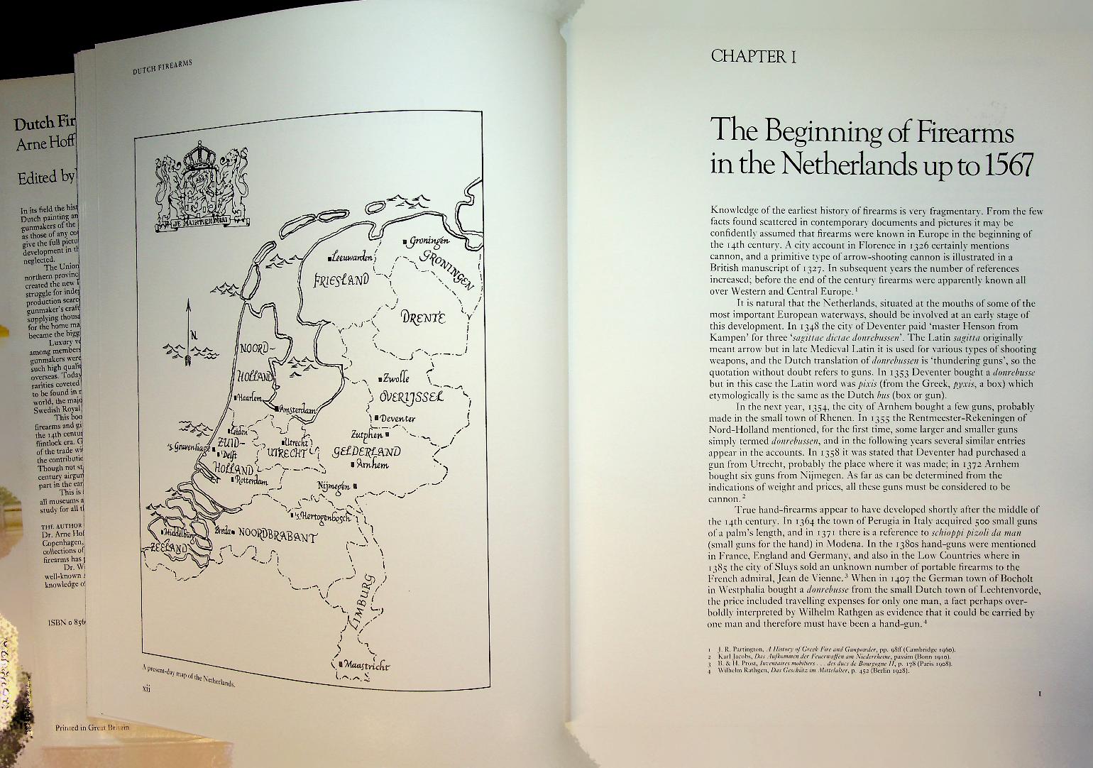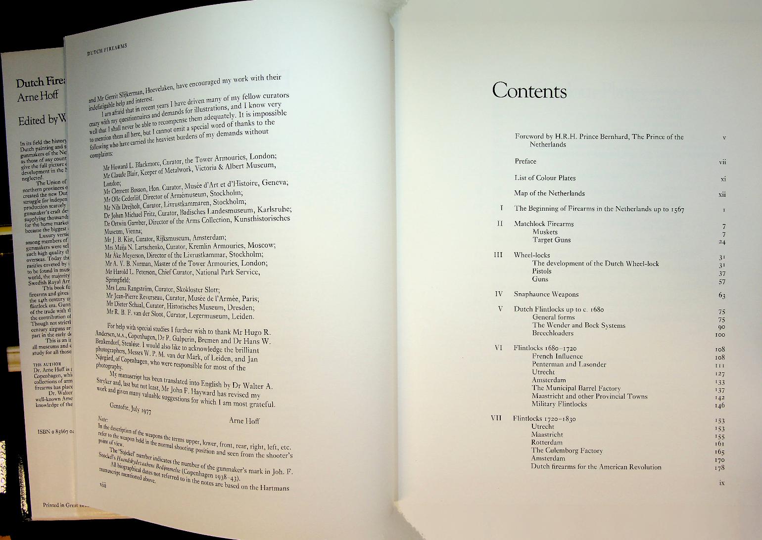 Hoff, Arne:1978 Sotheby UK, hardcover with dust jacket, 252 pages, illustrated. Dutch Firearms by Arne Hoff is an illustrated scholarly survey of Dutch firearms and gunmaking from around 1350 to 1830, examining their technical development, decoration, and historical context. It is especially valuable for arms historians and collectors for its detailed documentation of firearms, the firearms industry, and trade in the Netherlands. ISBN 9780856670411 / 0856670413 In very good condition