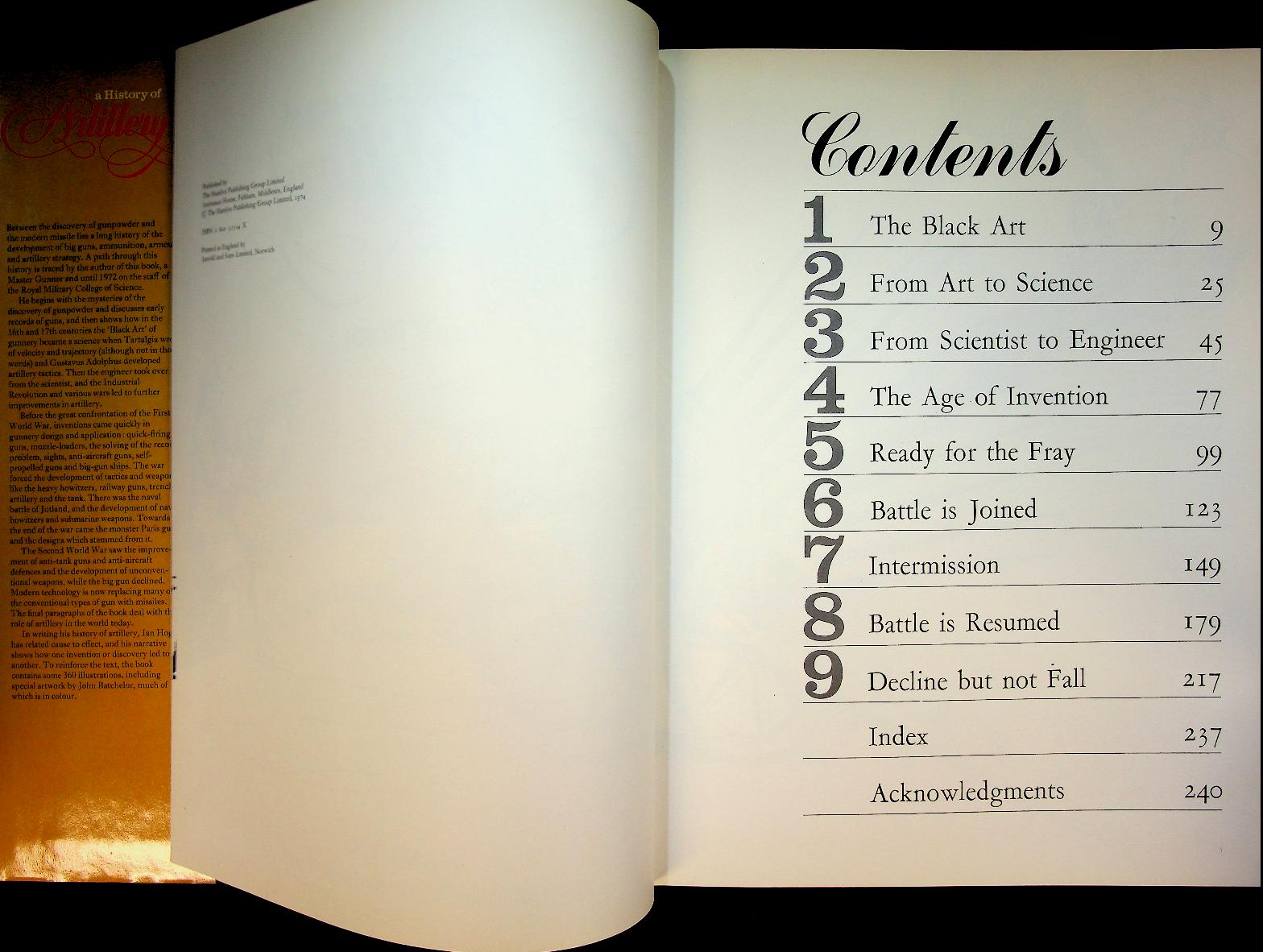 Hogg, Ian V: 1974 Hamlyn, hardcover with dustjacket 240 pages, with many photo's and illustrations. A History of Artillery by Ian V. Hogg traces the complete evolution of big guns from the earliest experiments with gunpowder and primitive cannons through to modern missiles and guided weapons, showing how each invention led to the next in an unbroken chain of cause and effect. Written by a former Master Gunner at the Royal Military College of Science, the book covers key milestones such as the development of artillery tactics, the Industrial Revolution's impact on gun design, the lessons of World War I and II, and the eventual rise of self-propelled guns and anti-aircraft weaponry, all richly illustrated with some 360 images. In very good condition ISBN 9780600313144 / 060031314X In very good condition