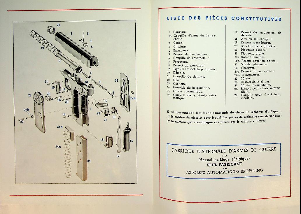 FN: Liege Herstal Belgium 1957, softcover folding-out 10 pages, with photos of the weapon, how to handle and large drawing with numbered parts. In very good condition. French language. rare!