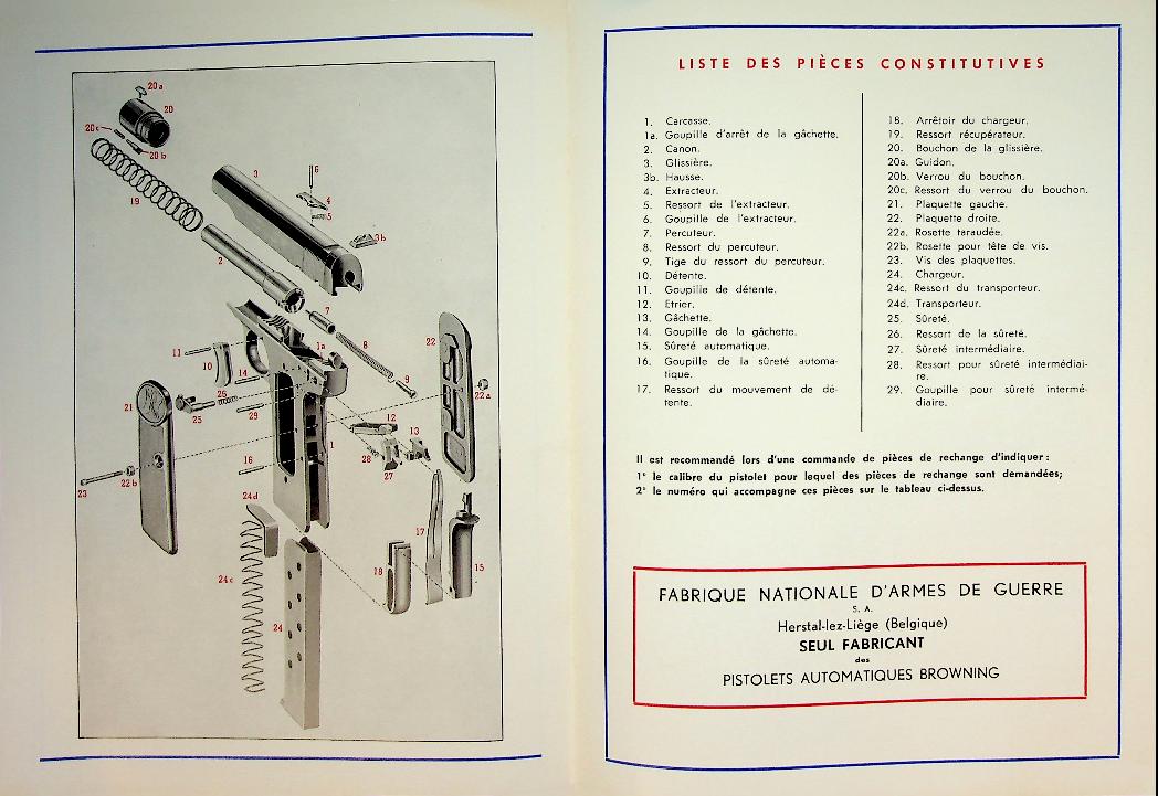 FN: Herstal Liege Belgium 1958, softcover folding-out 10 pages, with photos of the weapon, how to handle and large drawing with numbered parts. In very good condition. French language. rare!