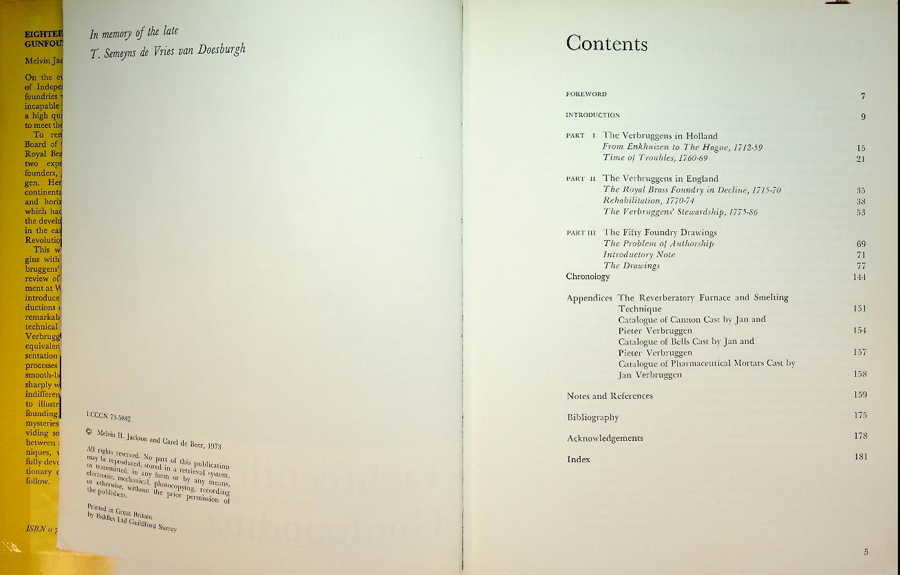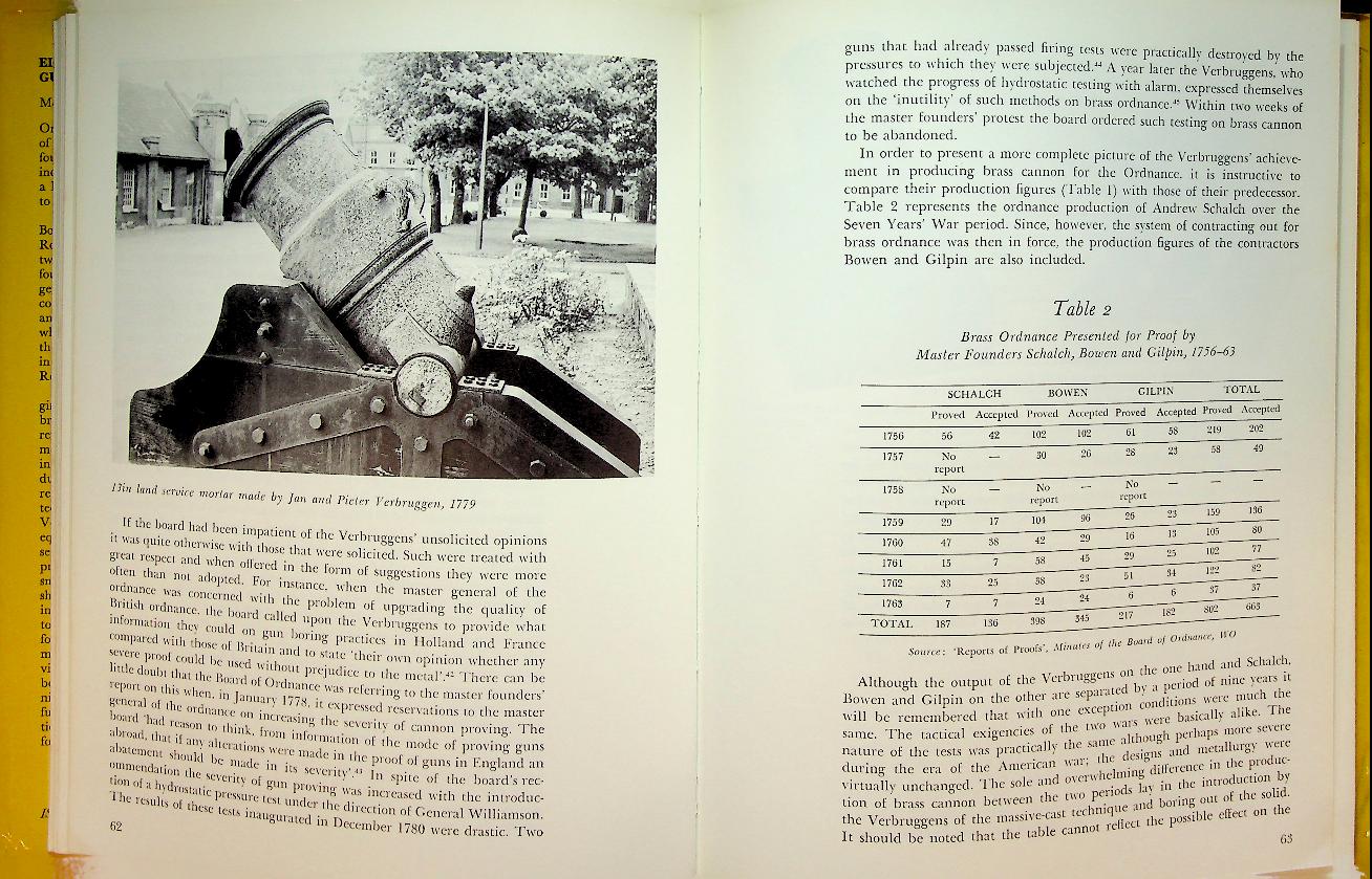 Jackson, M.H. and C. de Beer: 1973 UK, hardcover with dust jacket, 183 pages, illustrated. “Eighteenth Century Gunfounding; The Verbruggens at the Royal Brass Foundry; A Chapter in the History of Technology” examines how the Dutch founders Jan and Pieter Verbruggen revolutionized British artillery production at Woolwich by introducing advanced boring techniques, precision manufacturing, and tighter quality control in the late eighteenth century. The book places their work in the wider context of ordnance supply for the Royal Navy and Army, showing how technological innovation in gunfounding underpinned Britain’s growing military power. ISBN 9780715351369 / 0715351362 In very good condition