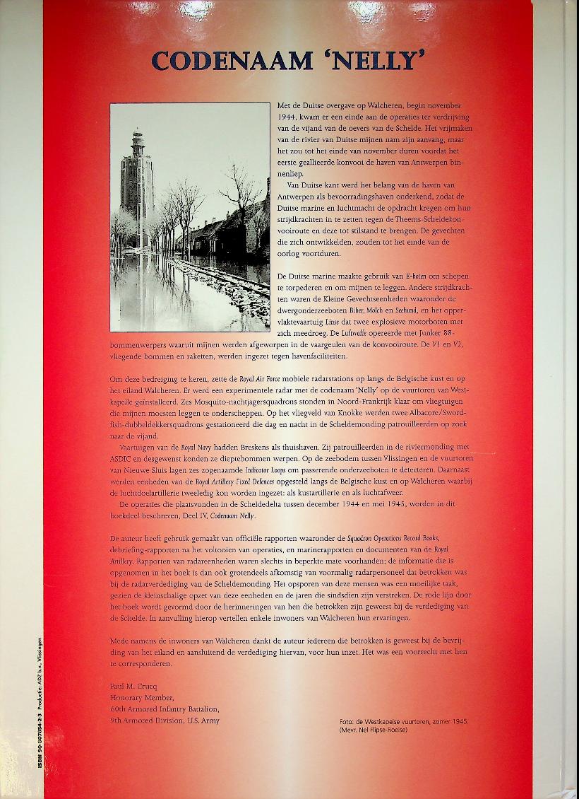 Crucq, Paul M.: 2004 ADZ Vlissingen, hardcover, 81 blz., geïllustreerd. Codenaam ‘Nelly’ beschrijft de Britse radareenheden die in de laatste oorlogsmaanden op Walcheren en in Vlaanderen werden opgesteld om de Scheldemonding en de aanvoerroute naar Antwerpen te beschermen. In compacte vorm komen geschiedenis, locaties en inzet van deze radarstellingen aan bod, met aandacht voor hun betekenis binnen de geallieerde luchtoorlog en de bevrijding van Zeeland. ISBN 9080785423 In zeer goede staat