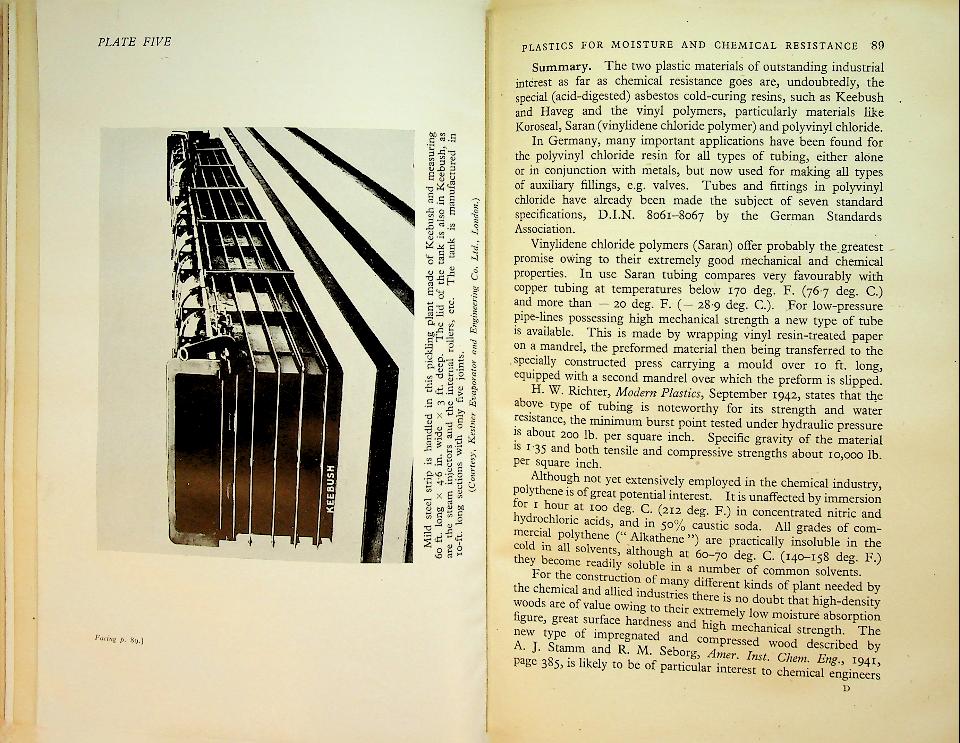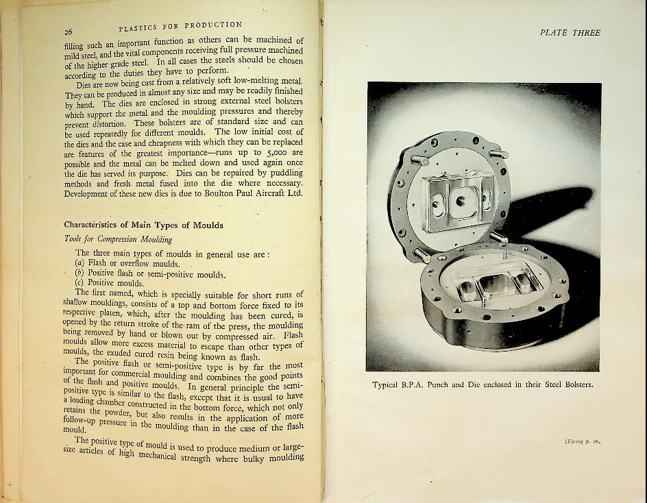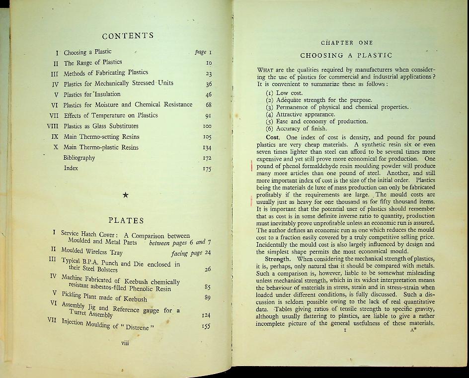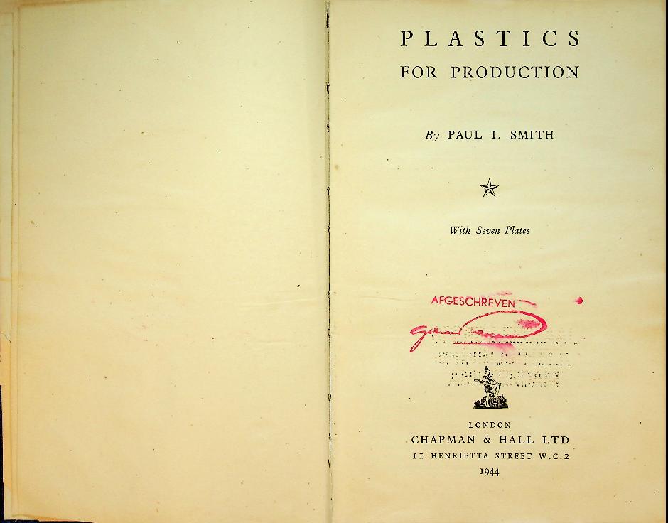 Smith, Paul I: 1944 London Chapman, hardcover, 180 pages, illustrated. Plastics for Production by Paul I. Smith is a practical introduction to the then-new field of industrial plastics, explaining the chemistry, properties, and processing of major thermoplastic and thermosetting materials for engineers and manufacturers. The 1944 edition emphasizes wartime and emerging peacetime applications, focusing on how to select suitable plastics and convert them efficiently into finished products. In good condition