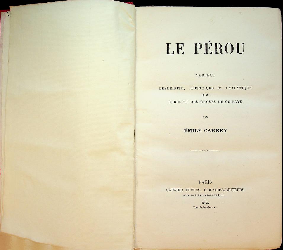 Carrey, E: 1875 Garnier Freres Paris, hardcover 511 pages. Peru in all his facettes. In very good condition