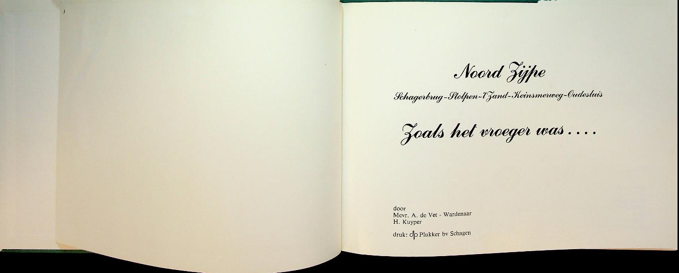 Vet-Wardenaar, A. de en H. Kuyper: Ca. 1980 Schgaen Plukker, hardcover 110 blz.. Noord Zijpe, zoals het vroeger was is een fotoboek met 53 oude ansichten van Schagerbrug, Stolpen, ’t Zand, Keinsmerweg en Oudesluis, voorzien van korte begeleidende teksten over het dorpsleven rond 1880–1925. Het boek verscheen ca. 1980 bij uitgeverij Plukker in Schagen In zeer goede staat
