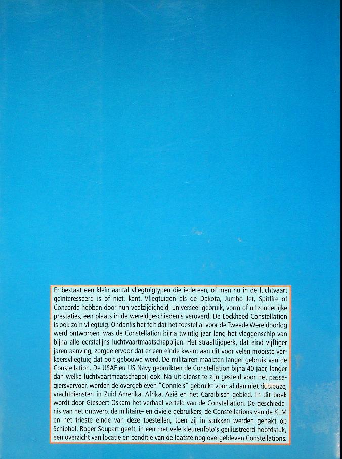 Oskam, G. en R. Soupart: 2001, softcover, 152 pages, illustrated. De Lockheed Constellation schetst in woord en beeld de ontwikkeling, techniek en inzet van dit iconische viermotorige verkeersvliegtuig, met veel aandacht voor ontwerp, varianten, maatschappijen en bemanningen. Luchtvaartjournalist Oskam beschrijft zowel de Nederlandse en Europese dienst bij o.a. KLM als de internationale geschiedenis, waardoor het boek aantrekkelijk is voor liefhebbers van klassieke luchtvaart en vliegtuigtechniek. ISBN 9789090150680 In zeer goede staat